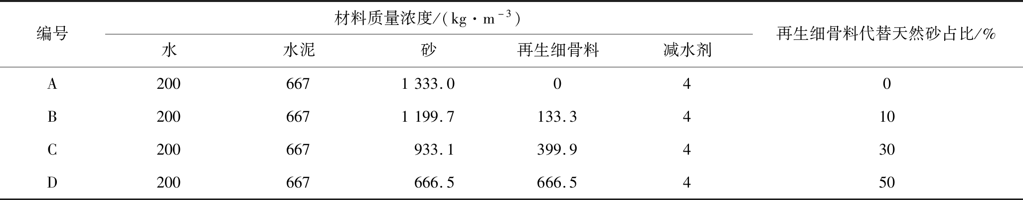 试验材料为海螺牌P·O 42.5硅酸盐水泥;淮河河砂,细度模数2.56;淮南市自来水;聚羧酸高效液态减水剂;再生细骨料(来自实验室相同配合比的废弃砂浆试件)具体配合比见表1,试件经过破碎后,过4.75 mm圆孔筛,得到粒径4.75 mm以下再生细骨料。