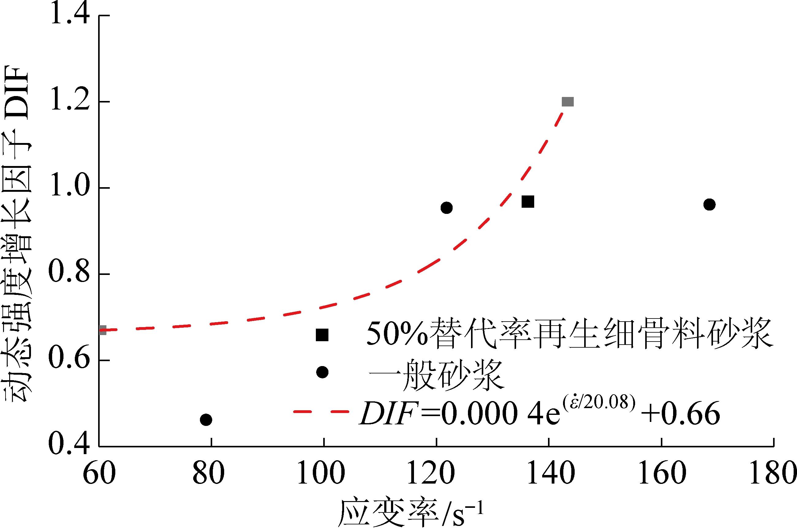 2)在应变率60.29 s-1到143.379 s-1内,50%替代率再生细骨料砂浆的动态峰值应力、动态极限应变与应变率均呈正相关关系,其动态强度增长因子