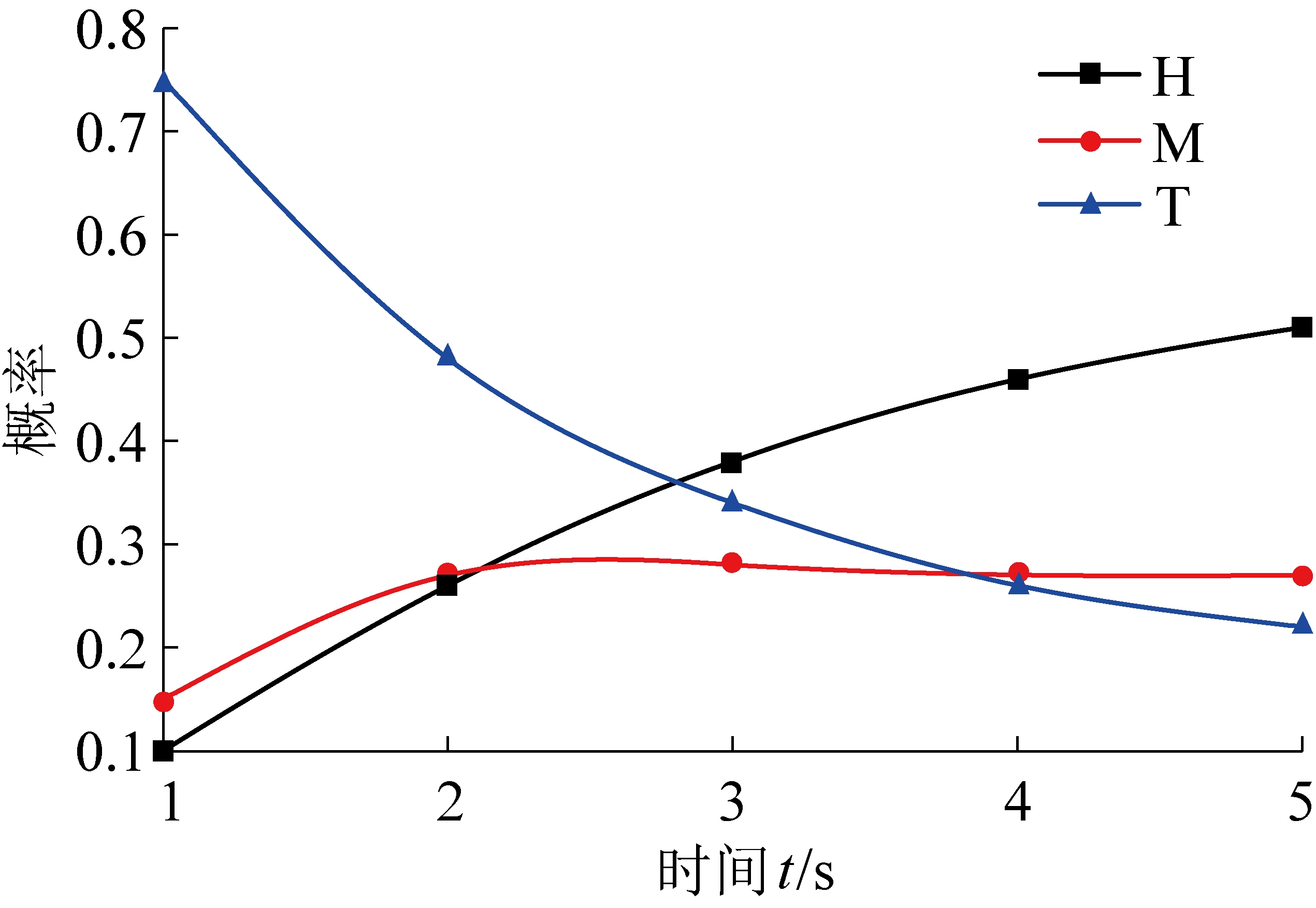 由专家经验知识判断,威胁等级先验概率:威胁等级H、M、T的先验概率P1分别为0.10、0.15、0.75,威胁等级转移概率见表5。