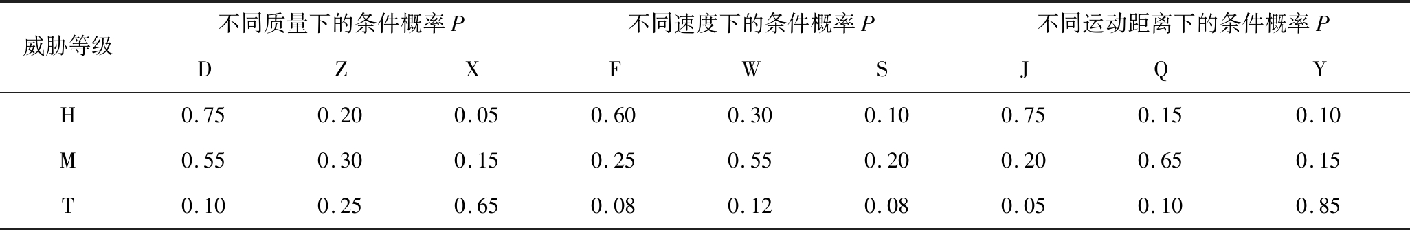 威胁等级不同质量下的条件概率P不同速度下的条件概率P不同运动距离下的条件概率PDZXFWSJQYH0.750.200.050.600.300.100.750.150.10M0.550.300.150.250.550.200.200.650.15T0.100.250.650.080.120.080.050.100.85