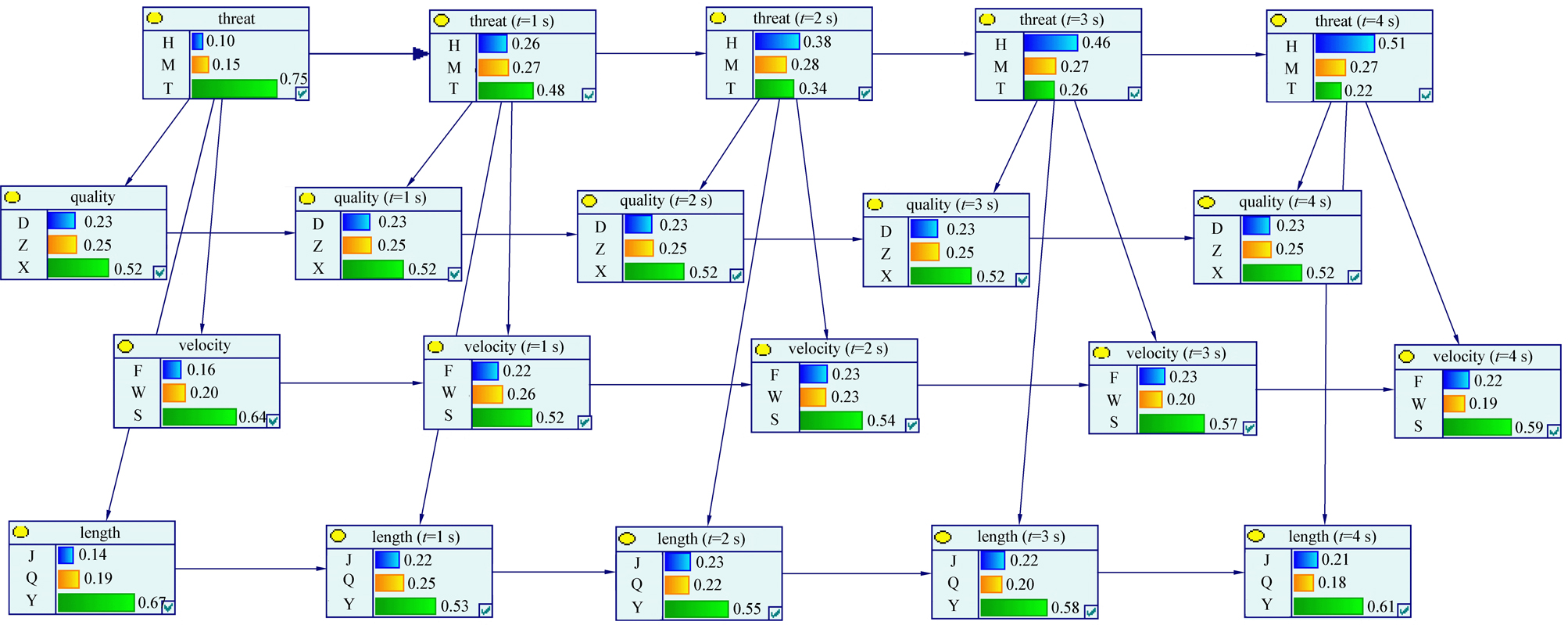 基于上述的先验概率、转移概率、条件概率,采用Genie软件将静态贝叶斯网络进行动态展开,得到动态贝叶斯网络的展开图和条形图如图3和图4所示,并得到飞矸威胁等级曲线如图5所示。