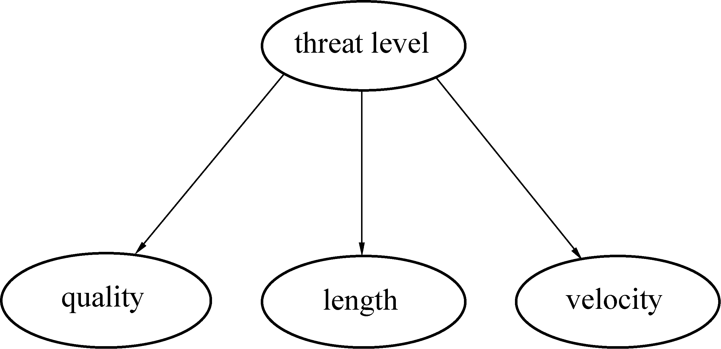贝叶斯网络能综合利用概率论和图论进行不确定事件分析和推理[14-18]。根据正交试验结果可知煤层倾角、飞矸质量、飞矸沿工作面运动距离和速度对飞矸威胁等级影响较大,由于考虑到实际工况下煤层倾角为定值,不随时间变化,故选取飞矸质量、沿工作面运动距离和速度作为观测节点,如图2所示。