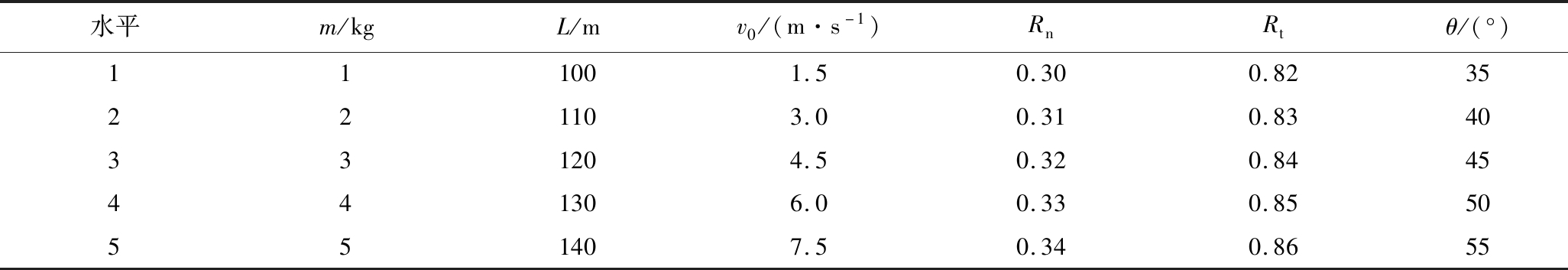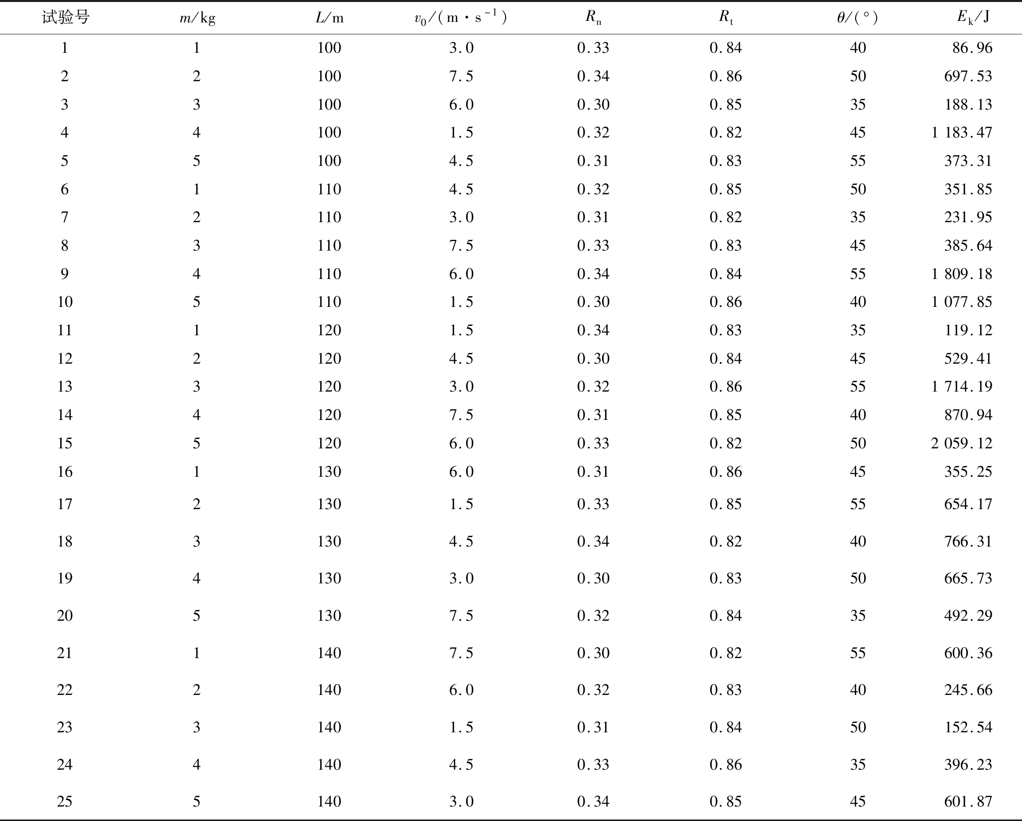 由于飞矸模型参数均具有随机性,当参数发生变化时,飞矸运动轨迹也会随之变化,同时飞矸的总动能、弹跳高度、沿工作面运动距离等观测变量也会发生显著变化,为了探究哪些因素对飞矸威胁具有决定性的影响,需通过正交试验进行分析[12-13]。