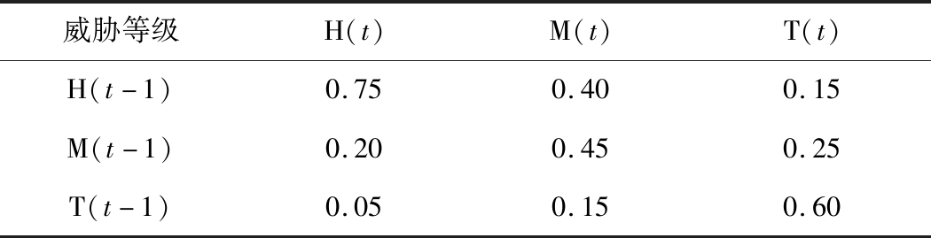 威胁等级H(t)M(t)T(t)H(t-1)0.750.400.15M(t-1)0.200.450.25T(t-1)0.050.150.60
