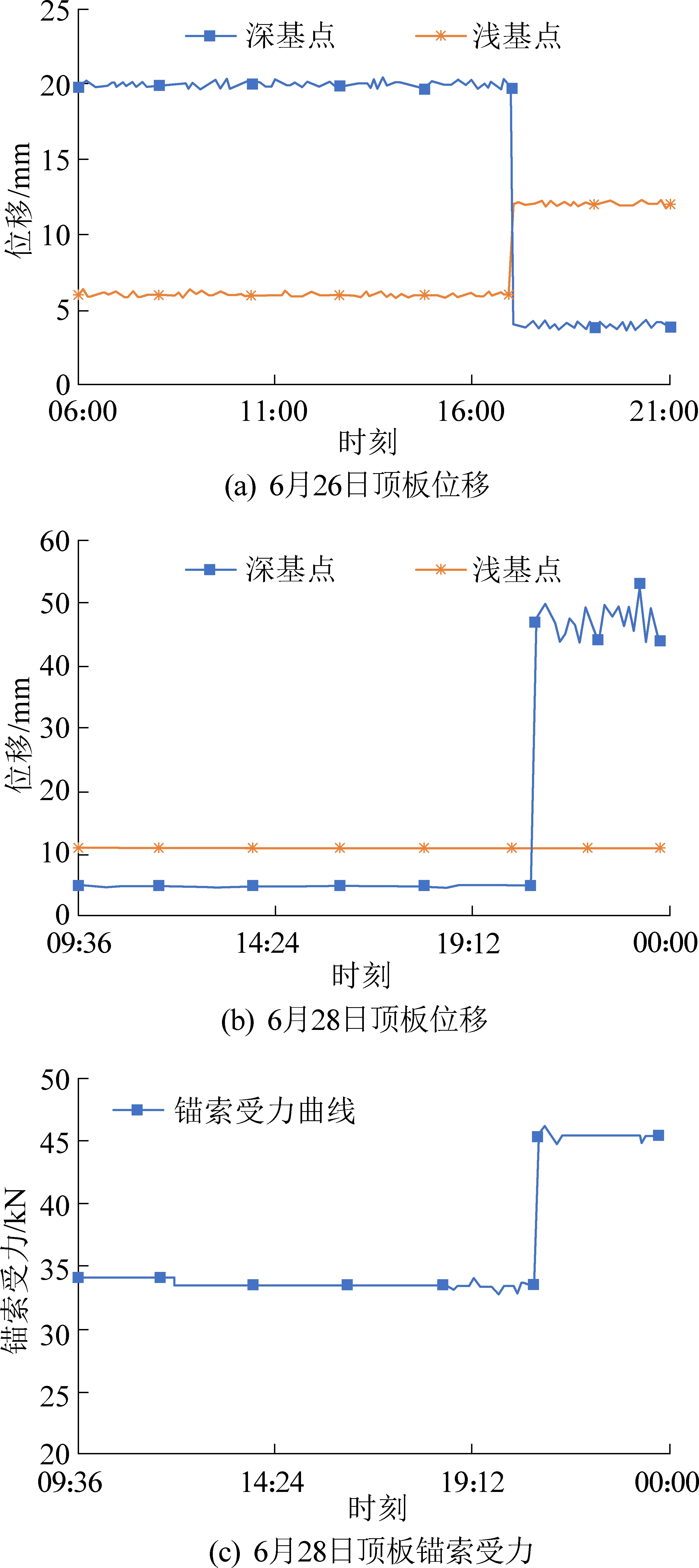 根据微震发生时间,对应微震发生地点查询邻近巷道围岩监测系统数据,图2为2次大能量微震事件发生时,围岩监测系统的数据响应情况。