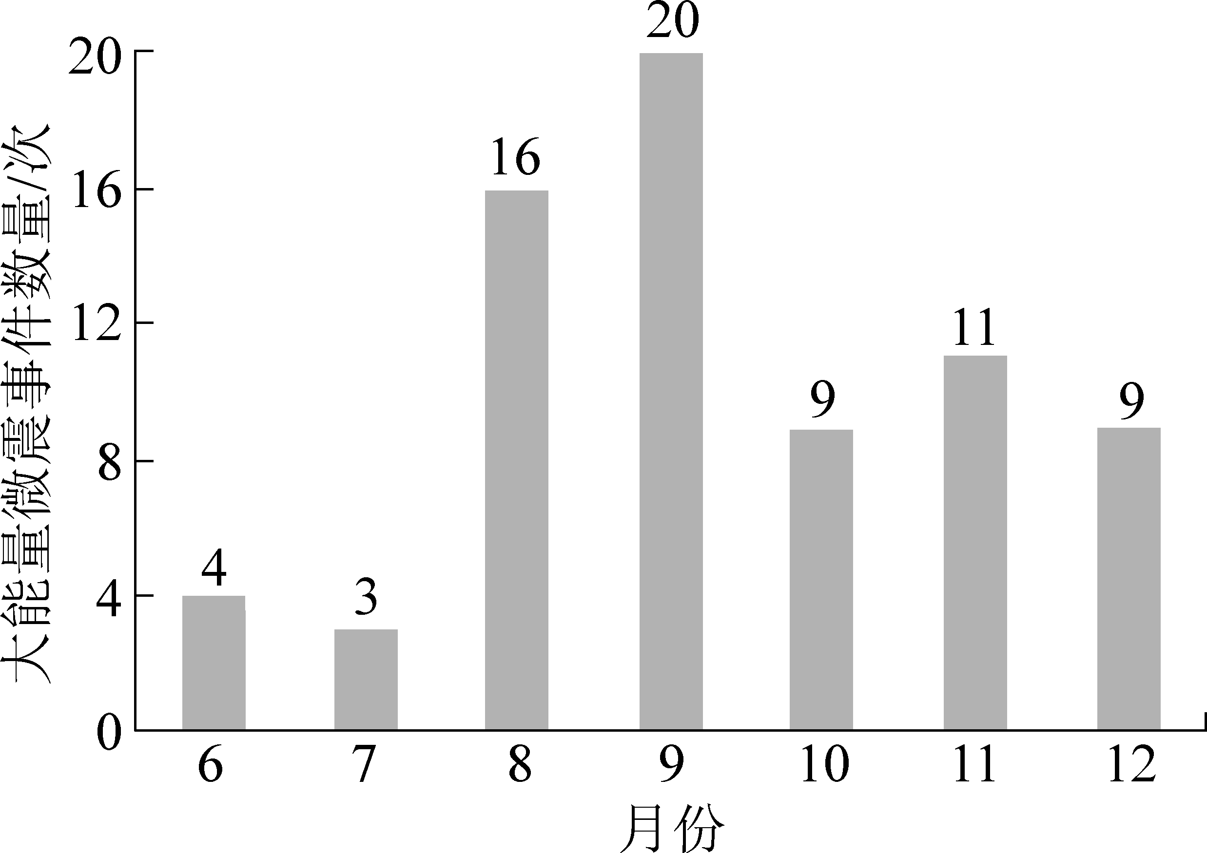2804工作面自“9.21”冲击显现后,开始采取上述防治措施,至2020年1月,工作面实现贯通。掘进过程中大能量微震事件的时间分布如图7所示,在9月份开展上述卸压工作后,大能量事件数量急剧减少,降幅最大达到55%,同时由于加强了支护,大能量事件也未对巷道造成冲击破坏,保障了2804工作面的顺利贯通。