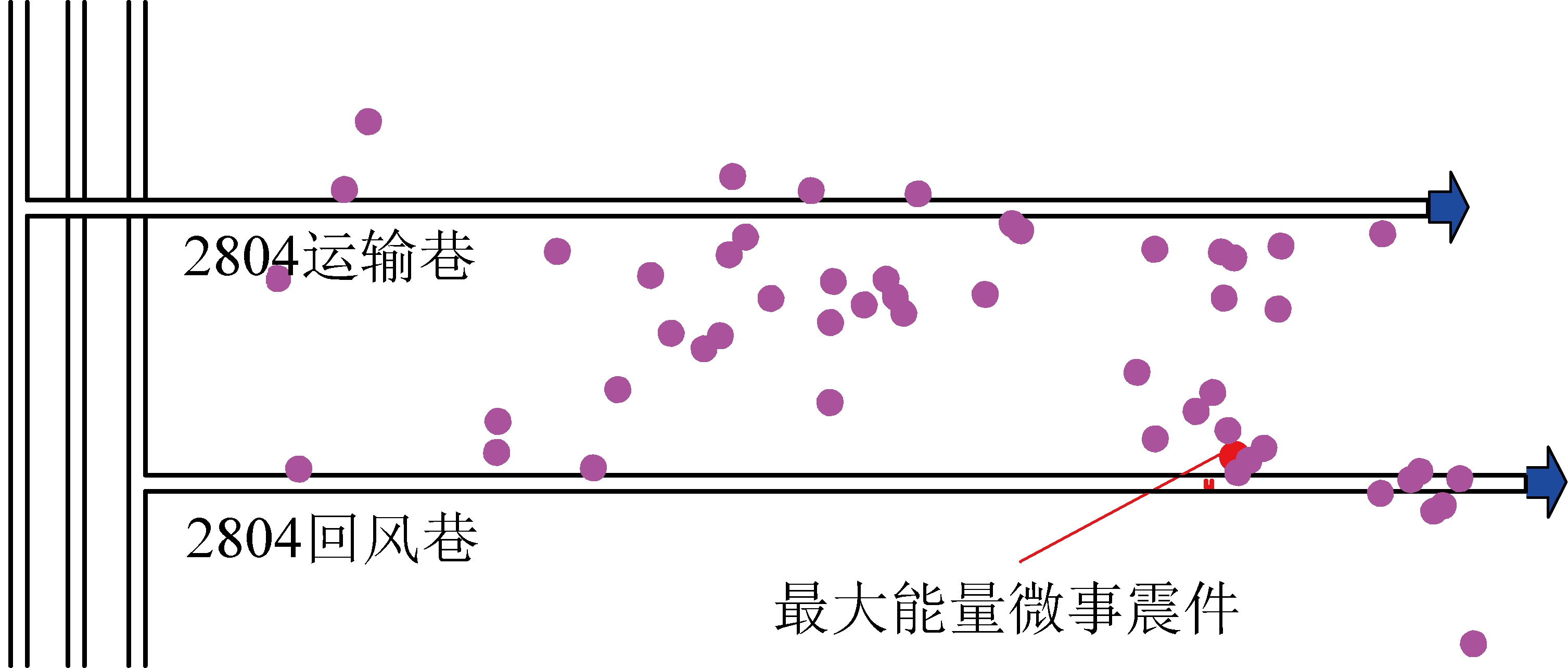 图1 2804工作面掘进期间104 J以上微震事件分布情况