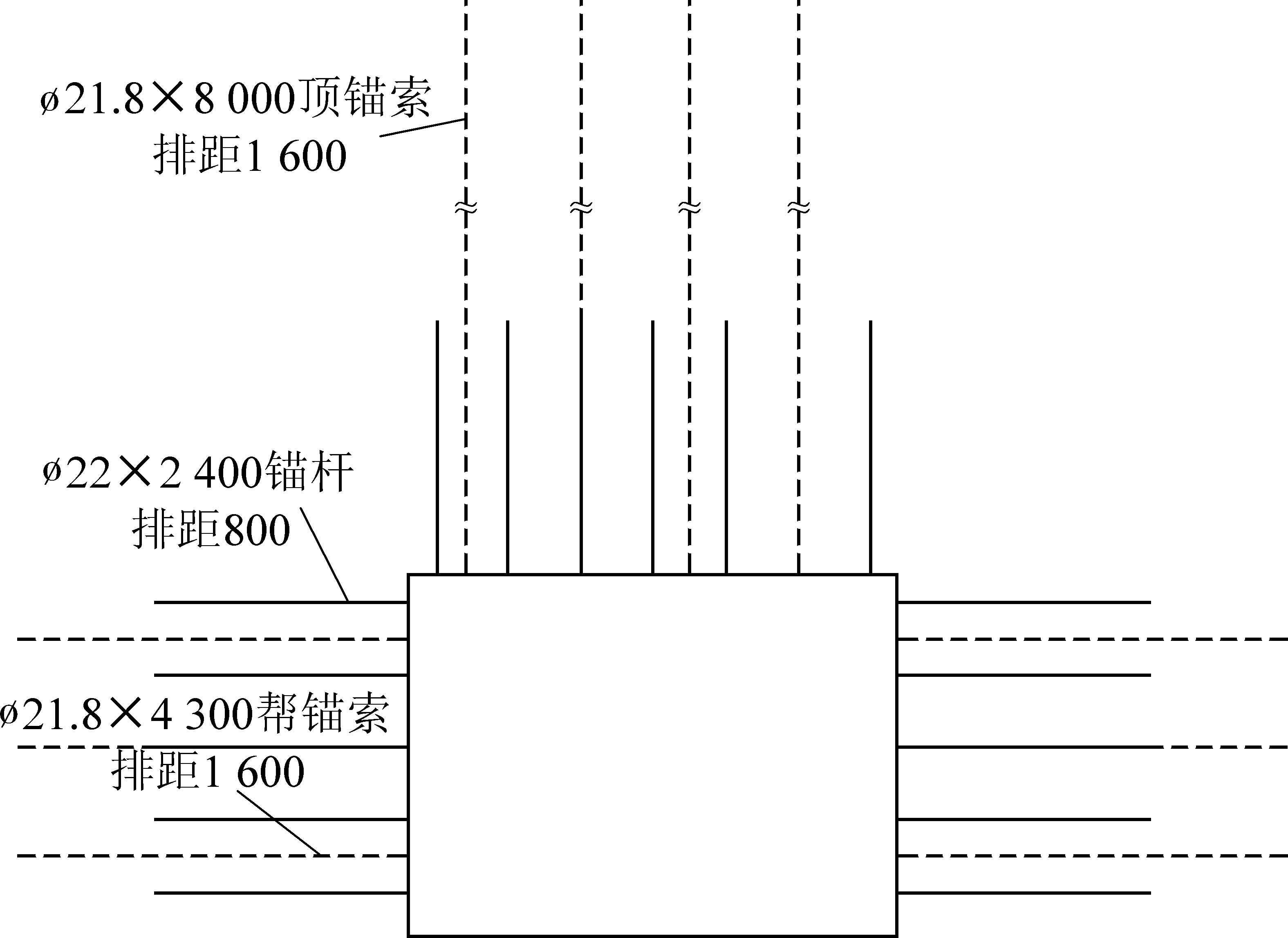 受大采深及多次矿震的累加损伤影响,巷道存在围岩破碎、顶板下沉等情况,针对上述问题,提出锚索补强的支护优化方案,增加巷道围岩系统的抗冲击能力。具体措施为,在原锚杆支护基础上补打ø21.8 mm锚索,顶锚索长度8 m,每排由2根增至4根,增加帮部锚索支护,长度4.3 m,每排布置3根,锚索间排距1 600 mm×1 600 mm,安装在两排锚杆间,拉拔力至250 kN。支护断面如图6所示。