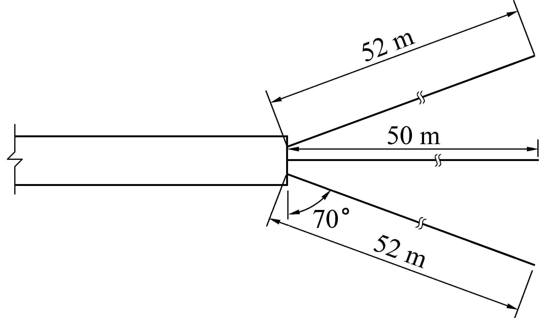 具体施工方式:在掘进工作面施工3个超前大直径卸压钻孔,孔径153 mm,孔深50 m,两侧钻孔向巷帮偏移20°,孔深为52 m,其布置参数如图4所示。当掘进工作面至卸压孔底部距离小于10 m时,补打下一轮钻孔,如此循环,即始终保证掘进工作面前方10 m处于卸压范围。