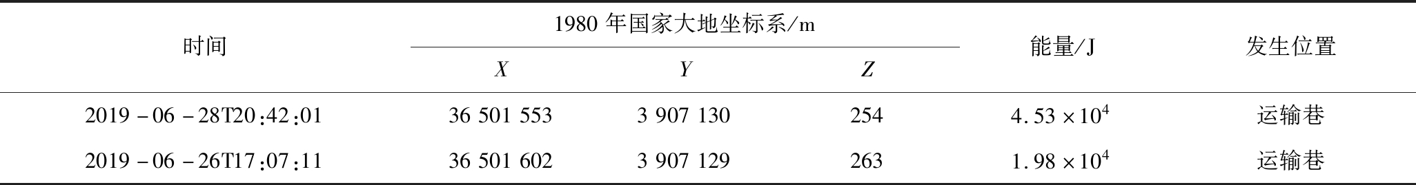 时间1980年国家大地坐标系/mXYZ能量/J发生位置2019-06-28T20:42:013650155339071302544.53×104运输巷2019-06-26T17:07:113650160239071292631.98×104运输巷
