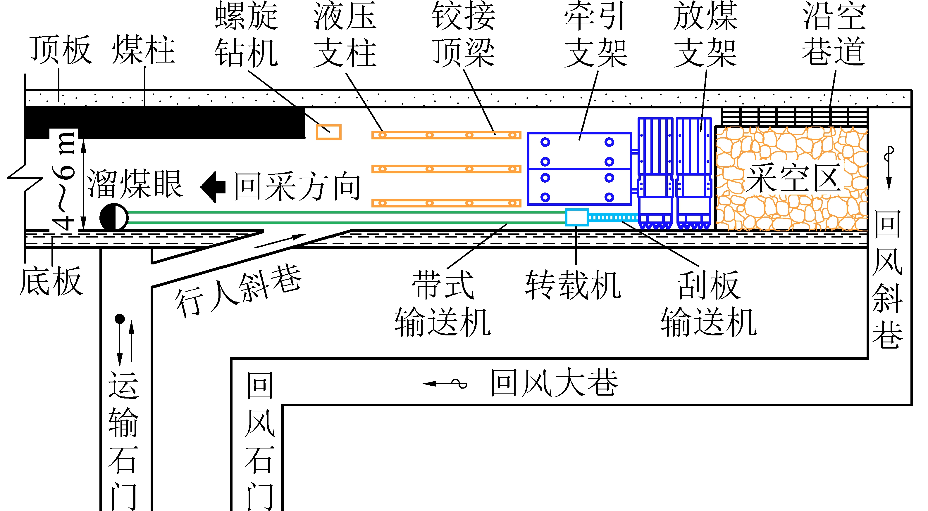 采用单一回采巷道形成工作面,实现采掘合一,后退式回收巷旁煤柱和放顶煤,采空区顶板侧沿空成巷形成“Z”形通风。工作面生产主要工序与流程如下。