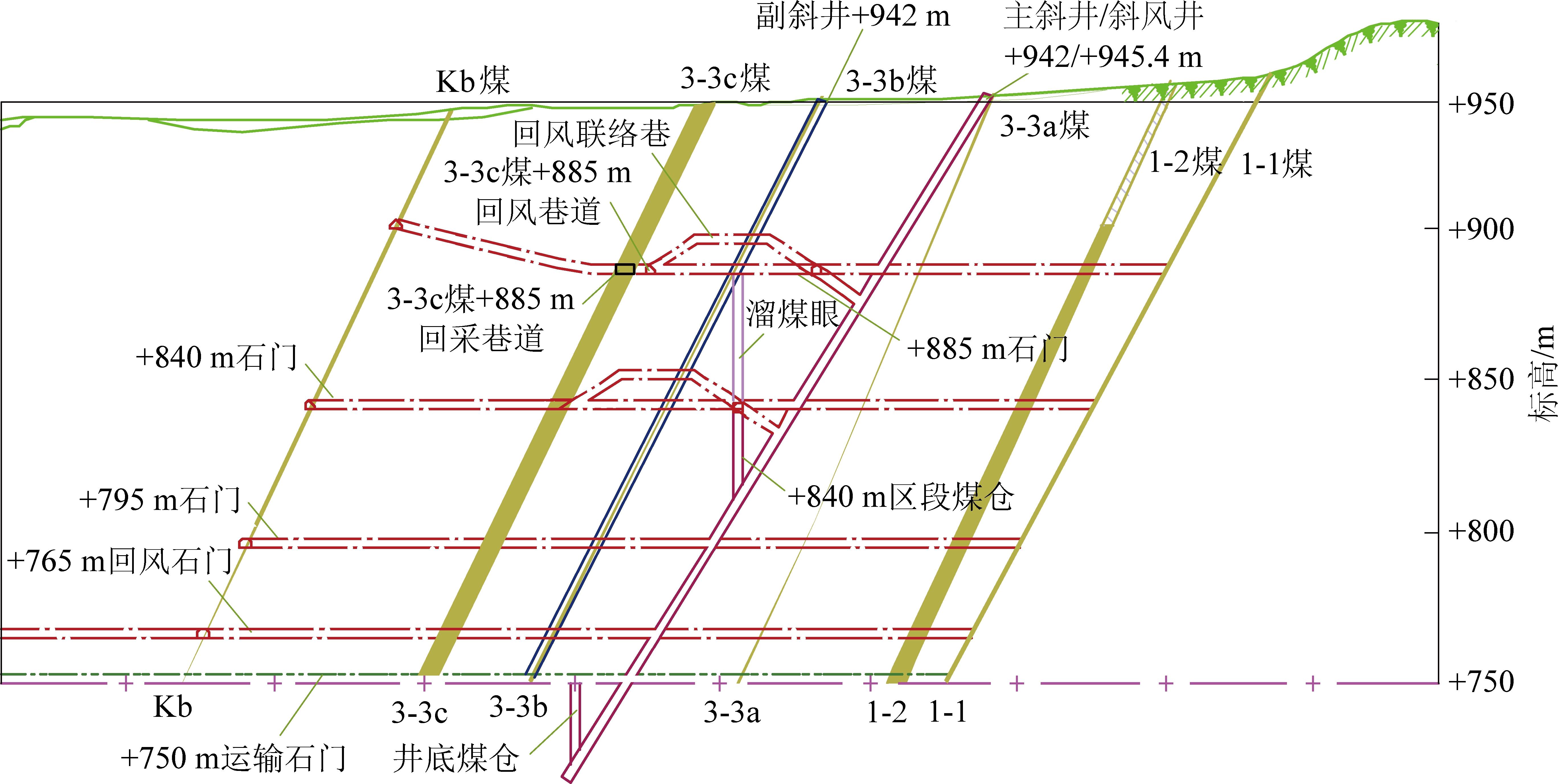 矿井采用单水平斜井开拓方式(图1)。主斜井井口标高+942 m,倾角16°,至井底斜长918 m,井筒净宽5.0 m,净断面18.3 m2,担负全矿井的煤炭及人员提升任务,兼作进风井和安全出口。副斜井沿3-3b煤层倾斜布置,井口标高+942 m,倾角18°,至井底斜长637 m,井筒净宽3.6 m,净断面10.8 m2,担负全矿井的设备、材料及矸石等提升任务,兼作进风井和安全出口。斜风井井口标高+945.4 m,倾角18°,至井底斜长631 m,井筒净宽3.8 m,净断面14.1 m2,担负全矿井的回风任务,兼安全出口。矿井主斜井、副斜井及斜风井分别承担采区上山功能,分别担负采区的煤炭运输、辅助提升及通风任务。采区采用联合布置开采,在采区各区段运输、回风水平从副斜井布置甩车场及石门揭露各煤层。