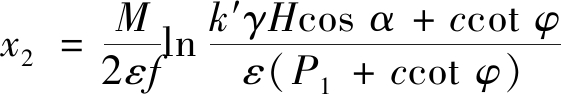 其中:M为煤层厚度,m;A为侧压系数;α为煤层倾角,(°);H为采深,m;φ0为煤层界面内摩擦角,(°);c0为煤层界面黏聚力,MPa;k、k′分别为平衡区x1和x2应力集中系数;γ为上覆岩层平均容重,kN/m3;γ0为煤层容重,kN/m3;Px为支护阻力;P1为上分段回采巷道支护阻力,kPa;f为煤层与顶底板接触面摩擦因数;ε为三轴压力系数;c为黏聚力,MPa。