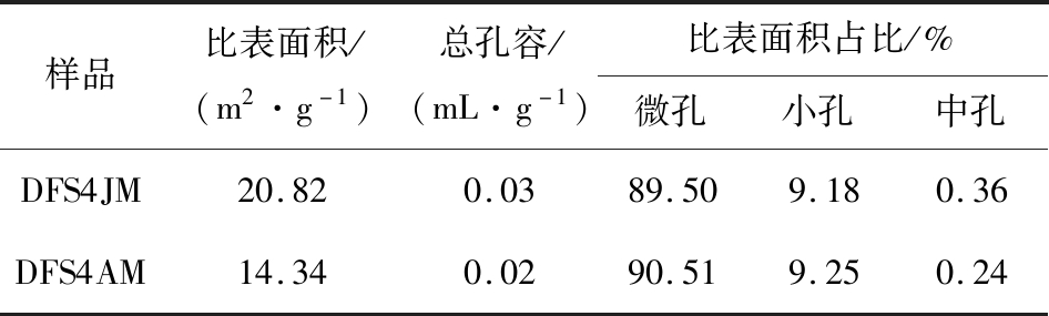 样品比表面积/(m2·g-1)总孔容/(mL·g-1)比表面积占比/%微孔小孔中孔DFS4JM20.820.0389.509.180.36DFS4AM14.340.0290.519.250.24