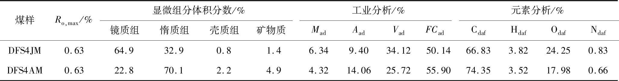 试验所用样品采自大佛寺井田的4号煤层,带回实验室后经过人工方式分离出镜煤(DFS4JM)和暗煤(DFS4AM),进行煤的基本性质测试以及吸附解吸试验。