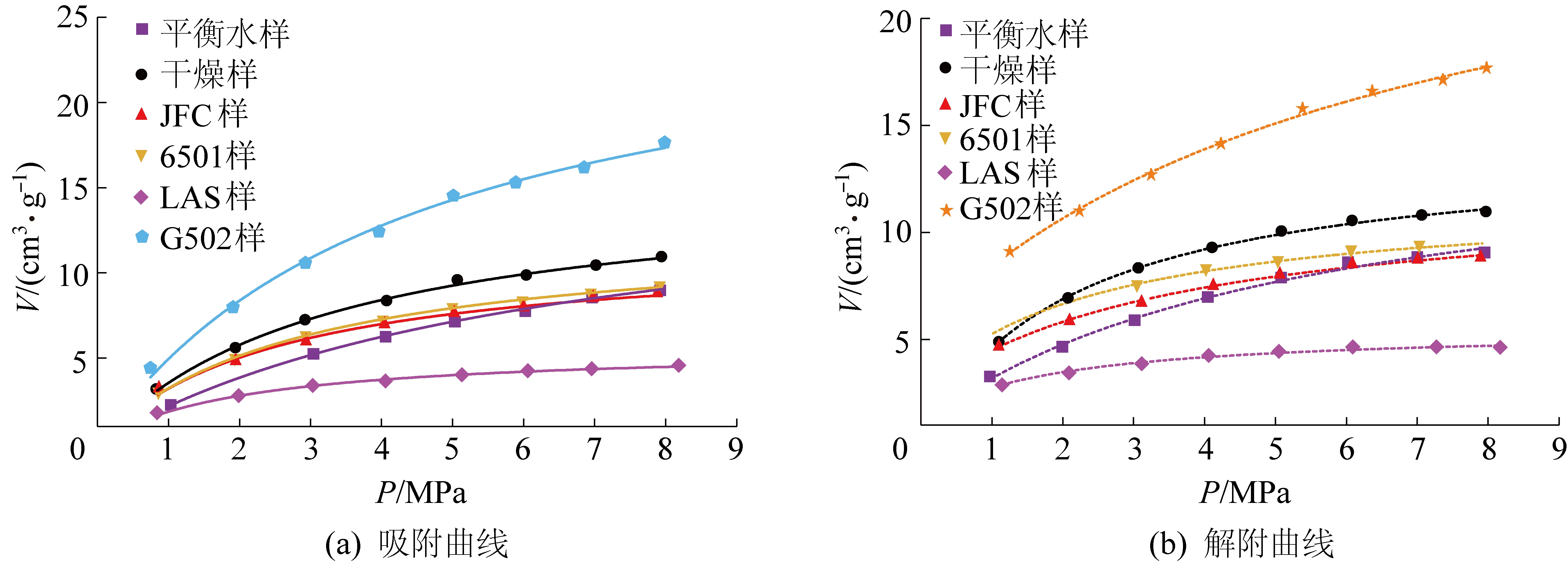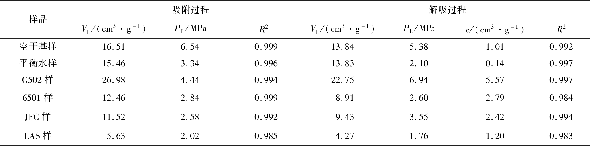 样品吸附过程解吸过程VL/(cm3·g-1)PL/MPaR2VL/(cm3·g-1)PL/MPac/(cm3·g-1)R2空干基样16.516.540.99913.845.381.010.992平衡水样15.463.340.99613.832.100.140.997G502样26.984.440.99422.756.945.570.9976501样12.462.840.9998.912.602.790.984JFC样11.522.580.9929.433.552.420.994LAS样5.632.020.9854.271.761.200.983