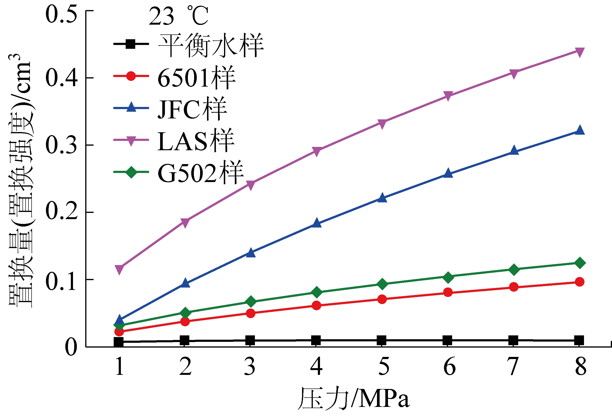 由于水分子更容易吸附在煤表面,加之润湿性更好的LAS、JFC、6501活性剂处理的煤样加强了煤对水的吸引力,使水分子更加有效占据煤表面吸附位置,在压力的进一步增大下,润湿性越好的煤,吸附水分子越多,置换出的甲烷量更大,置换率越高。总体而言,亲水剂可以促进水对甲烷的置换作用,疏水剂有利于甲烷的吸附,压力的升高可以促进置换作用的进行。