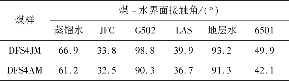 煤样煤-水界面接触角/(°)蒸馏水JFCG502LAS地层水6501DFS4JM66.933.898.839.993.249.9DFS4AM61.232.590.336.791.342.1