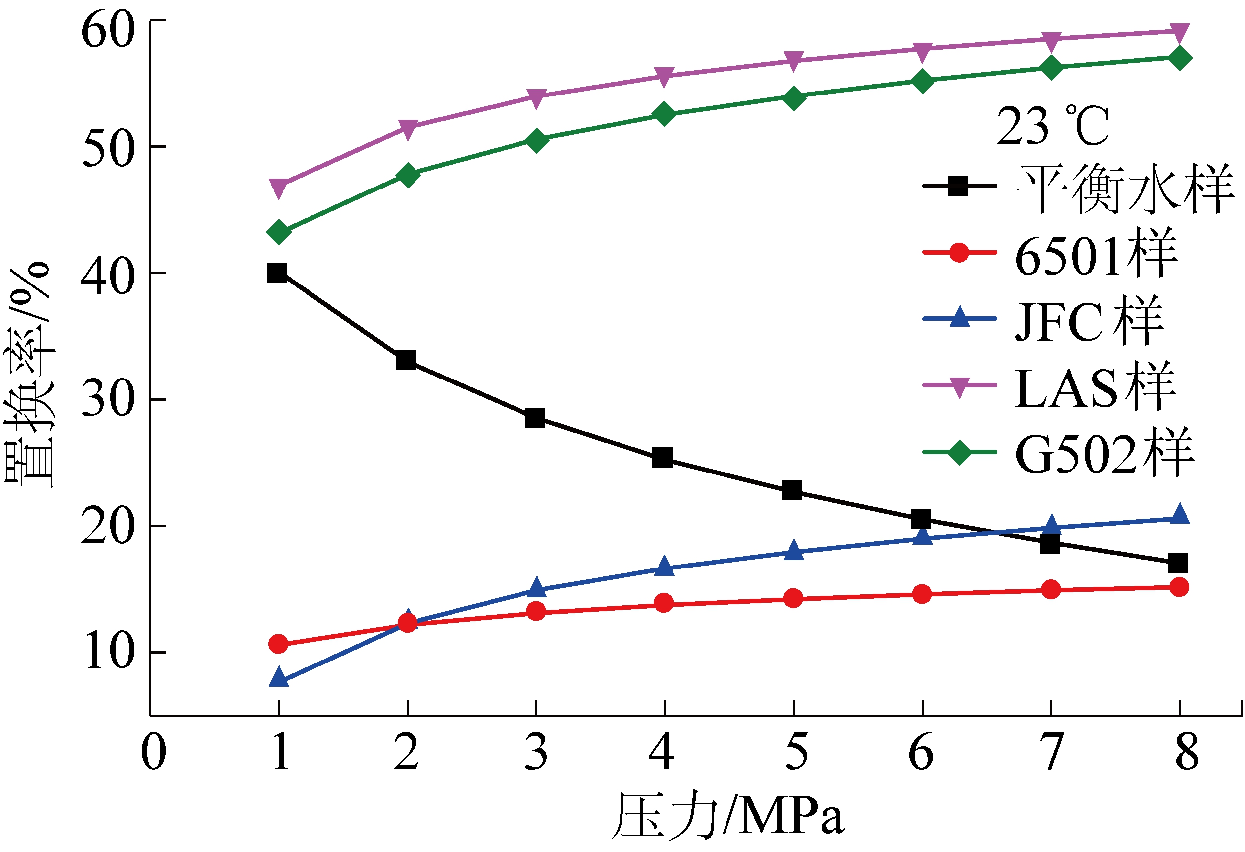 水分对甲烷的置换作用一般通过置换量和置换率来衡量。置换量主要是指相同压力下不同含水性煤样甲烷吸附量与空气干燥样甲烷吸附量之差。置换率主要是指置换量与空气干燥基样吸附量之比。计算结果表明,不同活性剂处理煤样置换量、置换率都随着压力增大而增大。同温同压下的置换量从大到小为LAS样、JFC样、G502样、6501样、平衡水样(图10),置换率从大到小排序为:LAS样、G502样、JFC样、6501样(图11)。