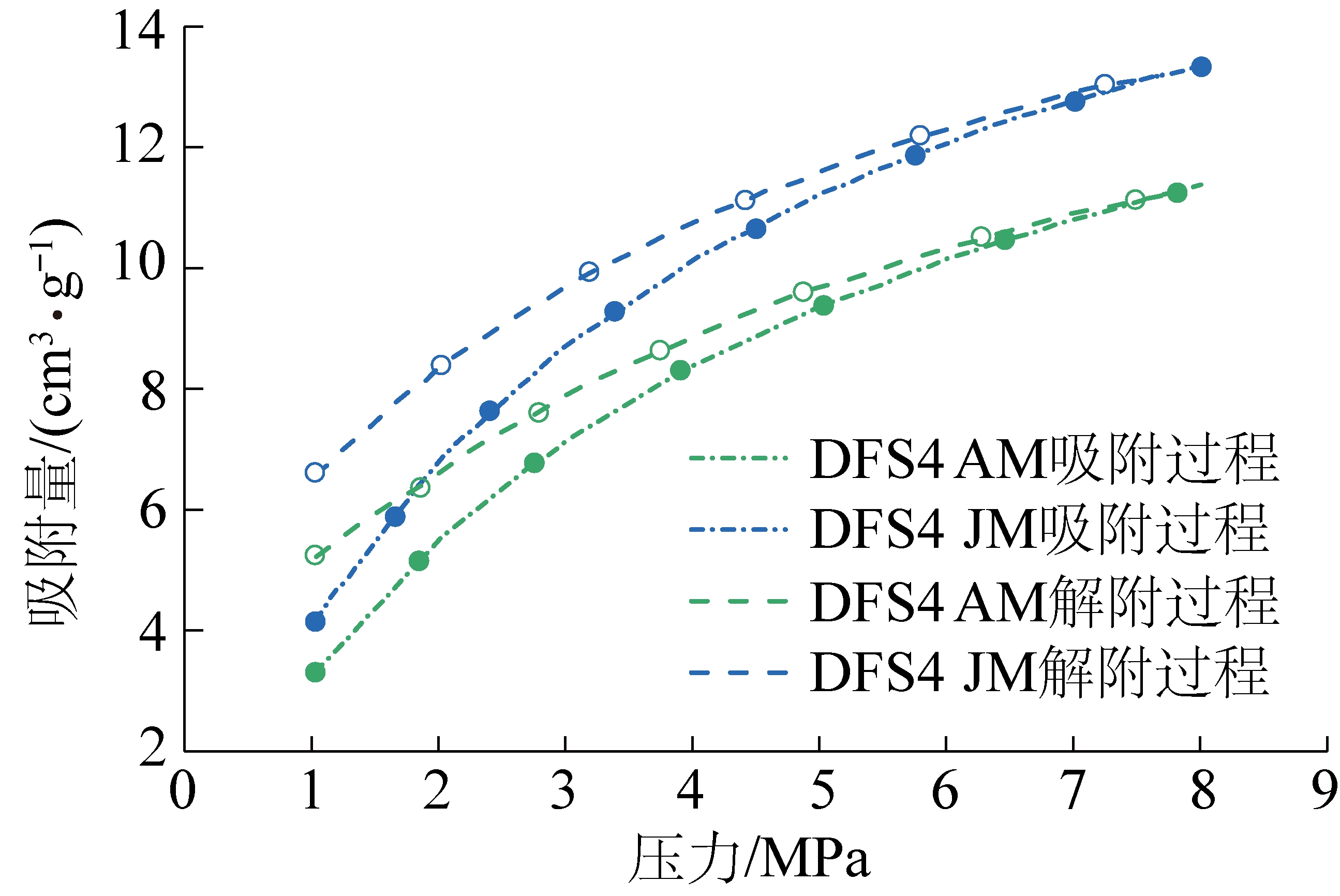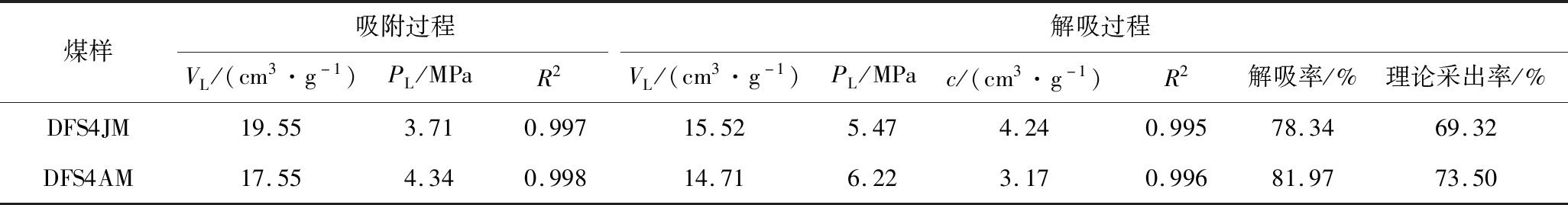 煤样吸附过程解吸过程VL/(cm3·g-1)PL/MPaR2VL/(cm3·g-1)PL/MPac/(cm3·g-1)R2解吸率/%理论采出率/%DFS4JM19.553.710.99715.525.474.240.99578.3469.32DFS4AM17.554.340.99814.716.223.170.99681.9773.50