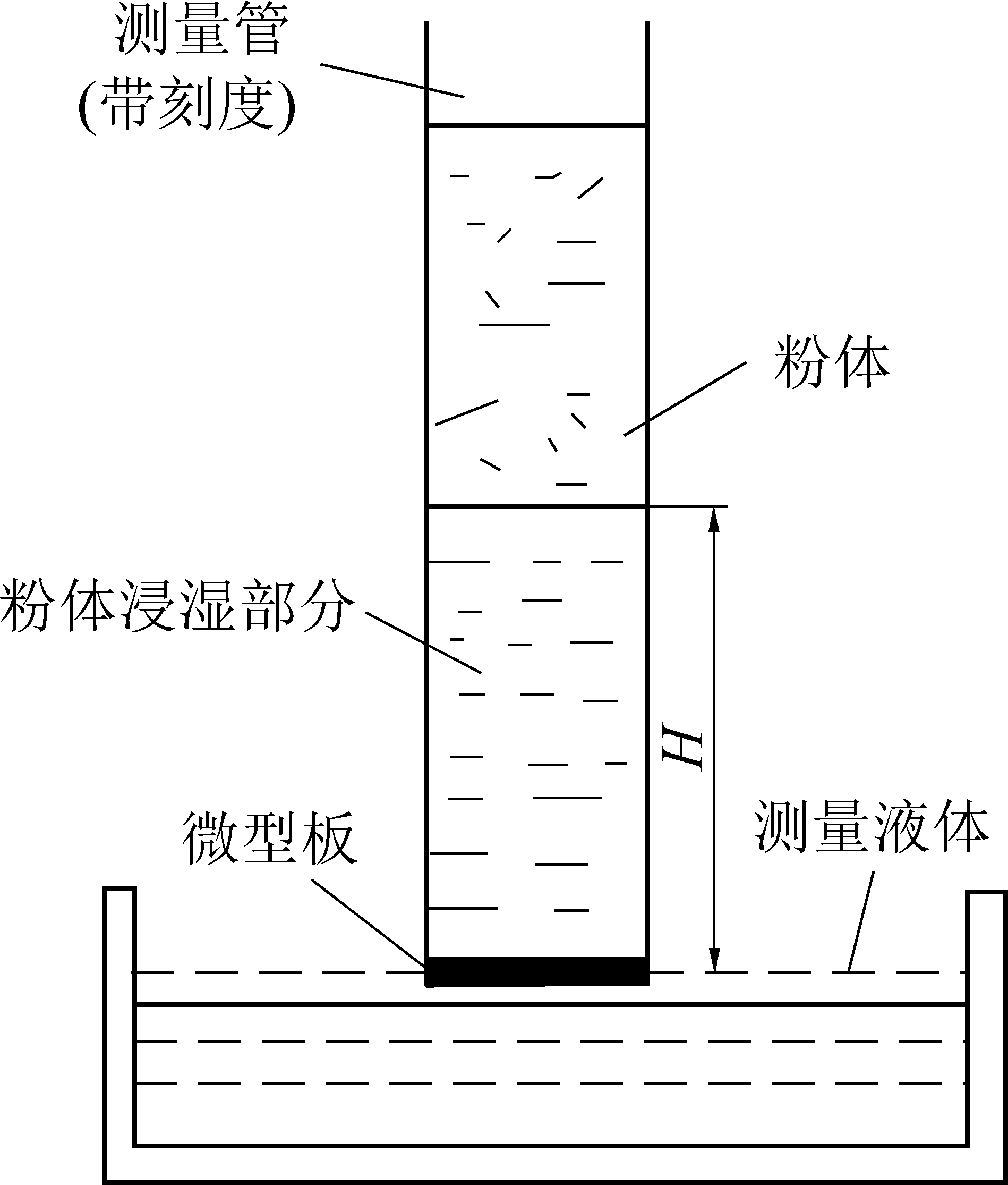 接触角测定实验仪器为OCA20视频光学接触角测量仪(图1),参照石油行业标准《油藏岩石润湿性测定方法》(SY/T 5153—2007),将煤样切割成边长为2 cm的正方体,先后用600目(23 μm)、1 200目(10 μm)砂纸打磨、抛光煤样表面,然后用不同溶液测定其接触角,每个样品测定3次,取平均值。通过粉末浸透速度法进一步判断测定煤的润湿性。将煤粉之间的孔隙看做毛细管,用过滤纸将玻璃底部和容器分开,充分摇晃压实后观察玻璃管里的液体上升高度,相同时间上升高度越高,润湿性越好,每隔4 h测定一次液面高度,累计测试72 h(图2)。