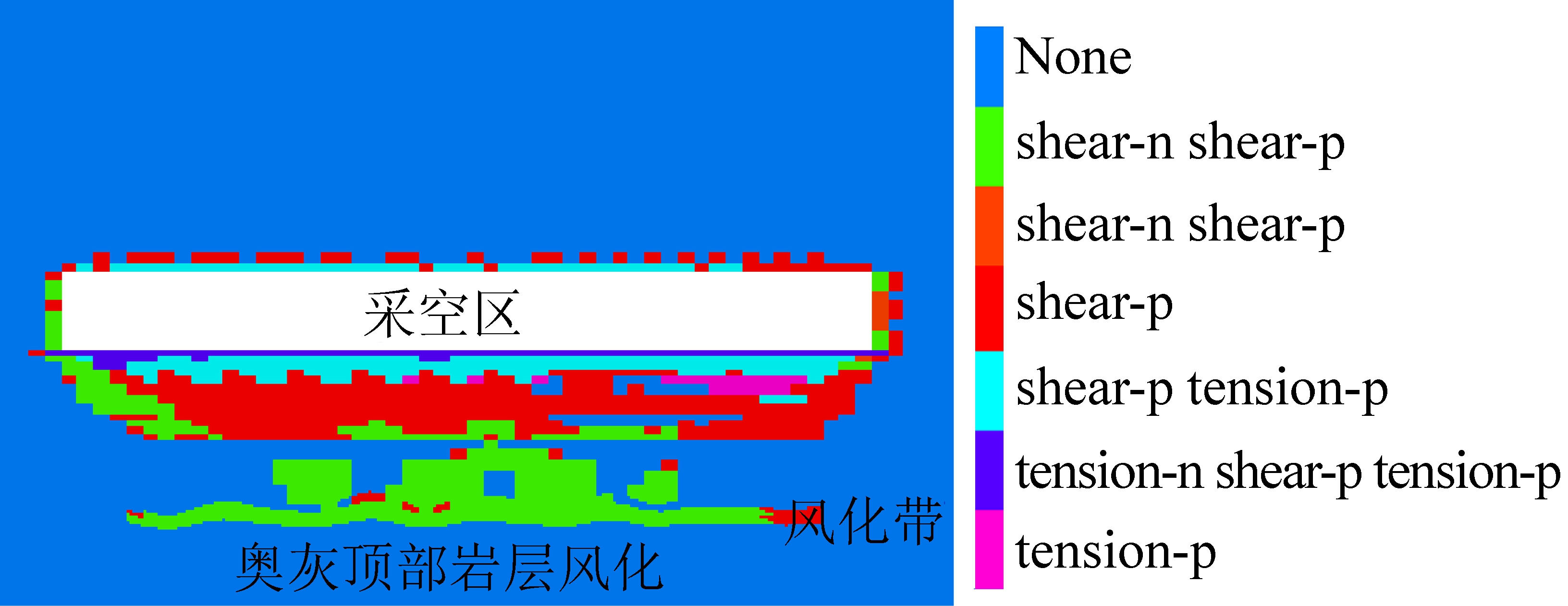 2)塑性破坏区特征。近奥灰特厚煤层开采的底板破坏形态(图9)显示,底板岩层破坏包括2部分:底板破坏区和风化带为中心的破坏区。风化带受扰动容易破坏,而且破坏区会向上方发育。工作面开挖250 m×250 m时,底板岩层或发生拉破坏或剪破坏,破坏区贯穿风化岩层上方的整个底板岩层。