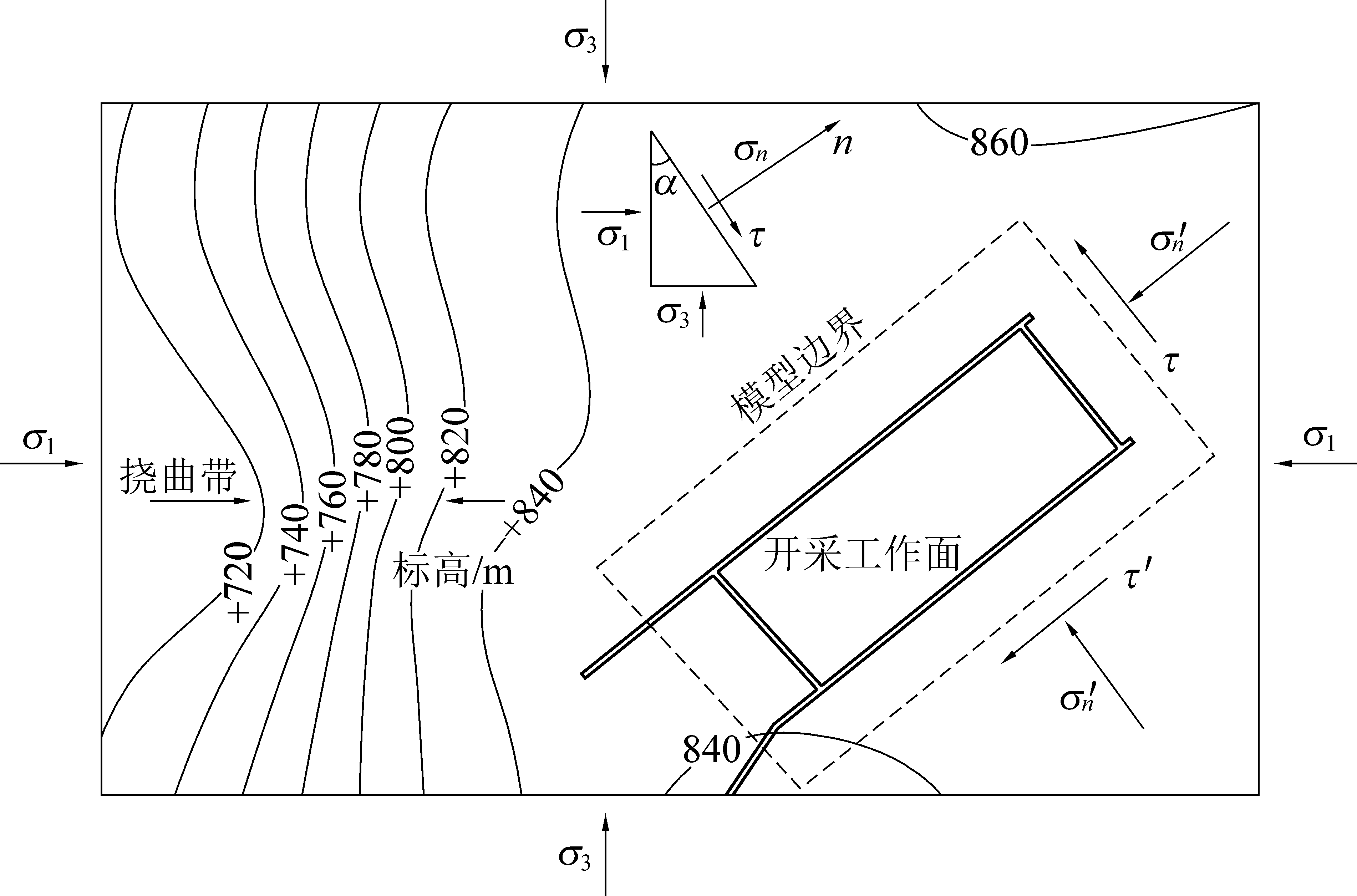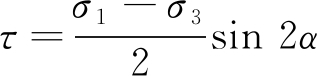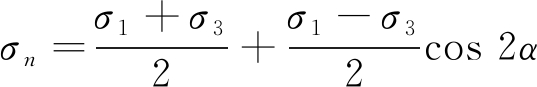 矿井酸刺沟(准格尔煤田南部)煤矿地应力测试表明[15]存在一种σHV型(σH>σV>σh)地应力场,σH、σv、σh分别为最大水平主应力,垂直主应力,最小水平主应力。设以开采方向为法线的斜截面的外法线n与主应力方向夹角为α,参考酸刺沟最大水平主应力,最大主应力σ1取7.94 MPa,最小主应力σ3取6.70 MPa,则该斜截面上的正应力σn和切应力τ分别为