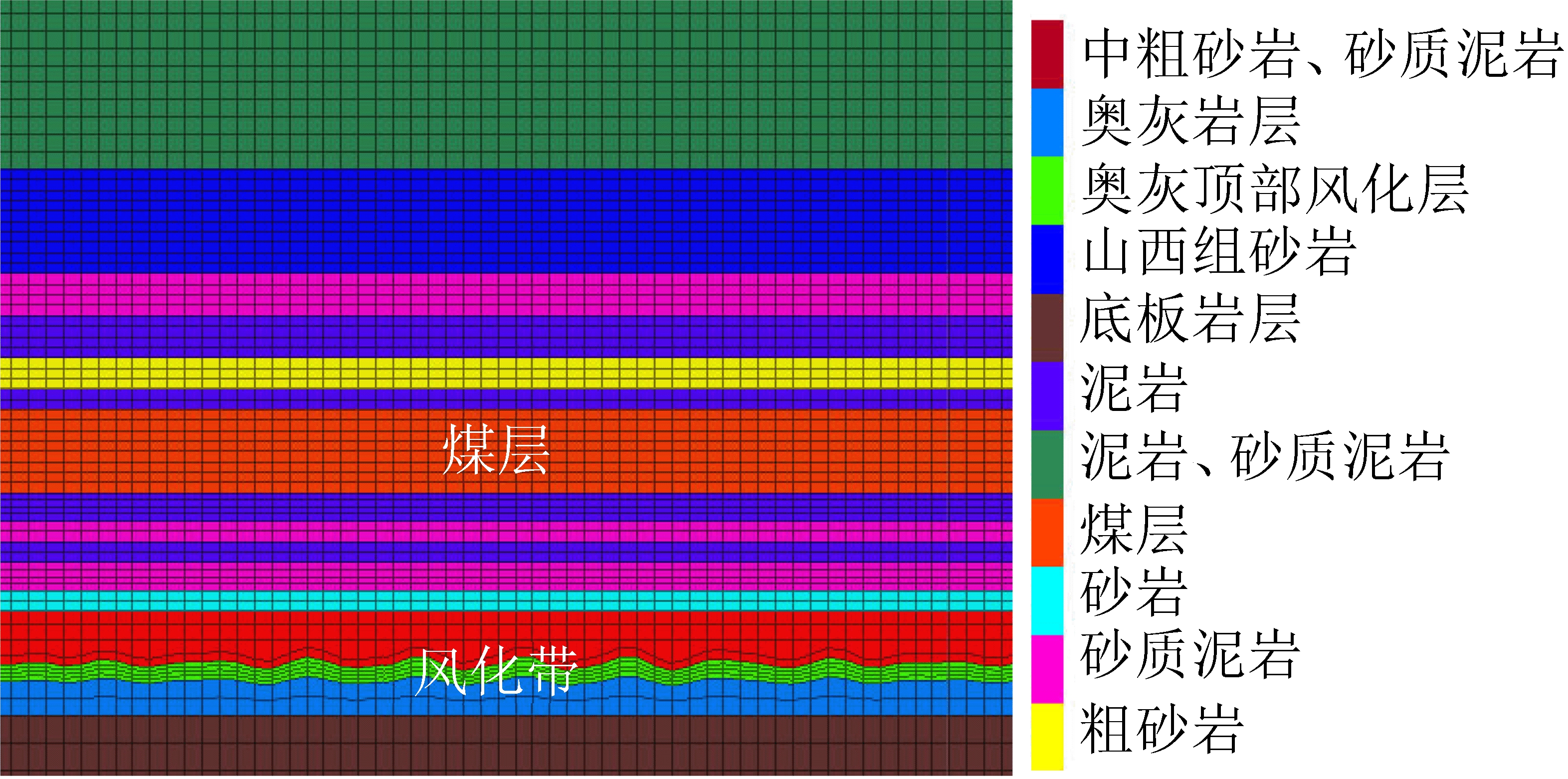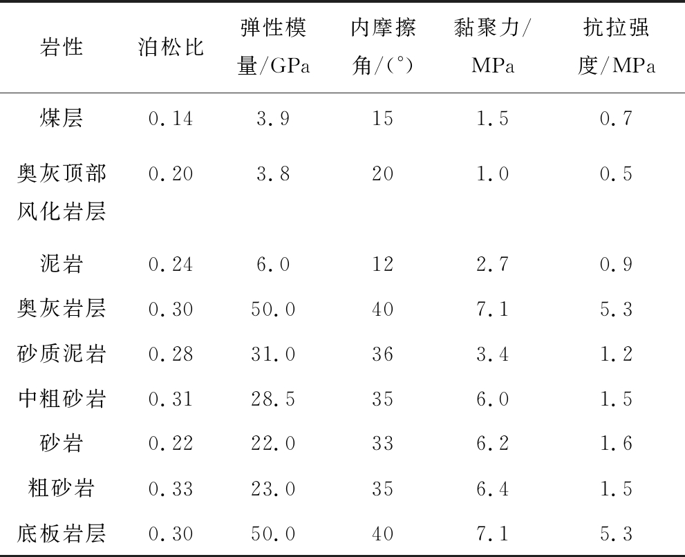 岩性泊松比弹性模量/GPa内摩擦角/(°)黏聚力/MPa抗拉强度/MPa煤层0.143.9151.50.7奥灰顶部风化岩层0.203.8201.00.5泥岩0.246.0122.70.9奥灰岩层0.3050.0407.15.3砂质泥岩0.2831.0363.41.2中粗砂岩0.3128.5356.01.5砂岩0.2222.0336.21.6粗砂岩0.3323.0356.41.5底板岩层0.3050.0407.15.3
