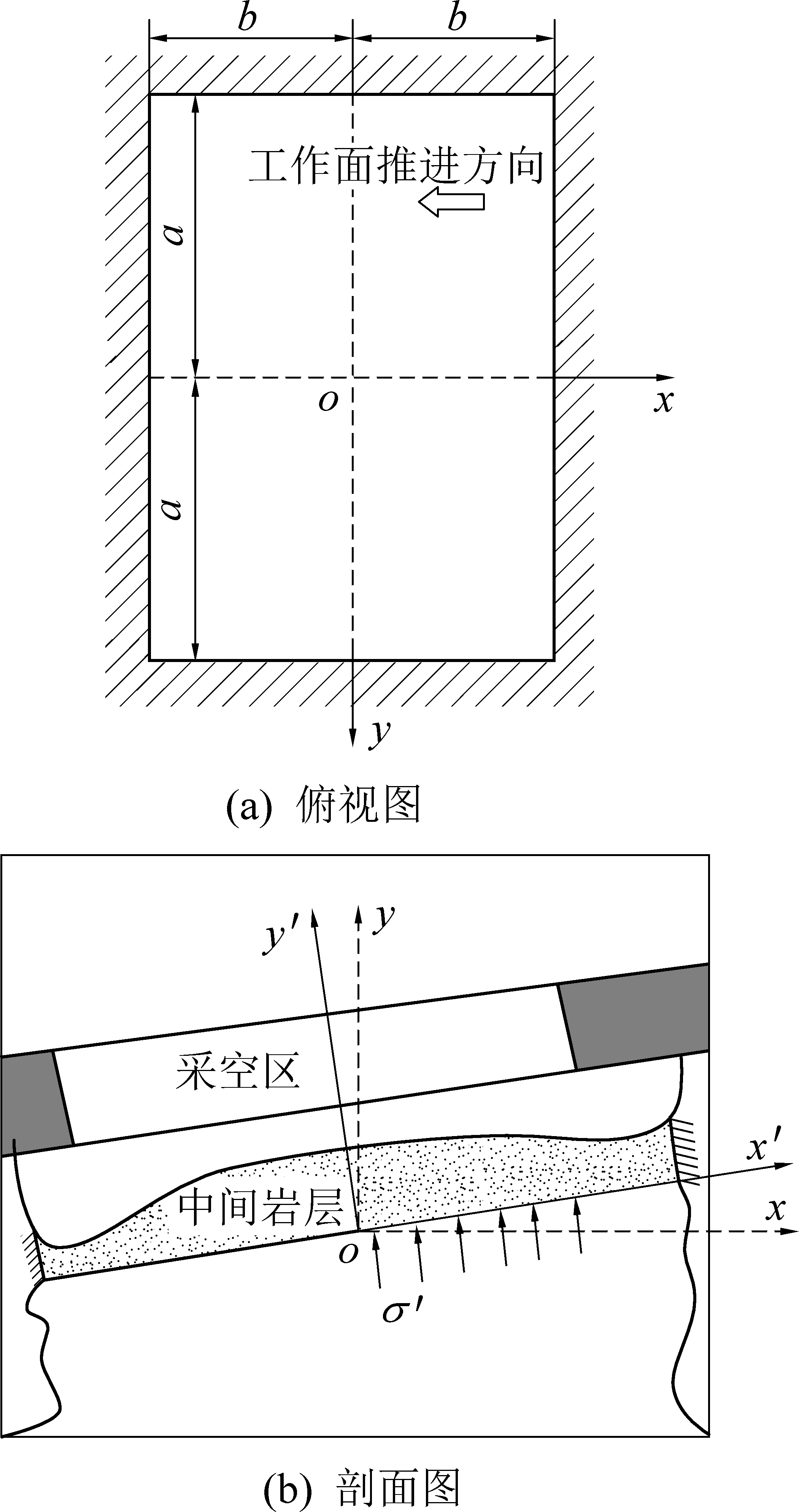 设有矩形薄板,长为2a,宽为2b,假设四端为固定端约束,底部为分布力约束。忽略中间岩层上方的破坏岩体重力影响,中间岩层的简化模型符合薄板弯曲模型,如图4所示。开采后,压剪破坏区下方的完整底板岩体为四边固定的薄板,受到均布载荷作用(水平地应力的分量σ′)。
