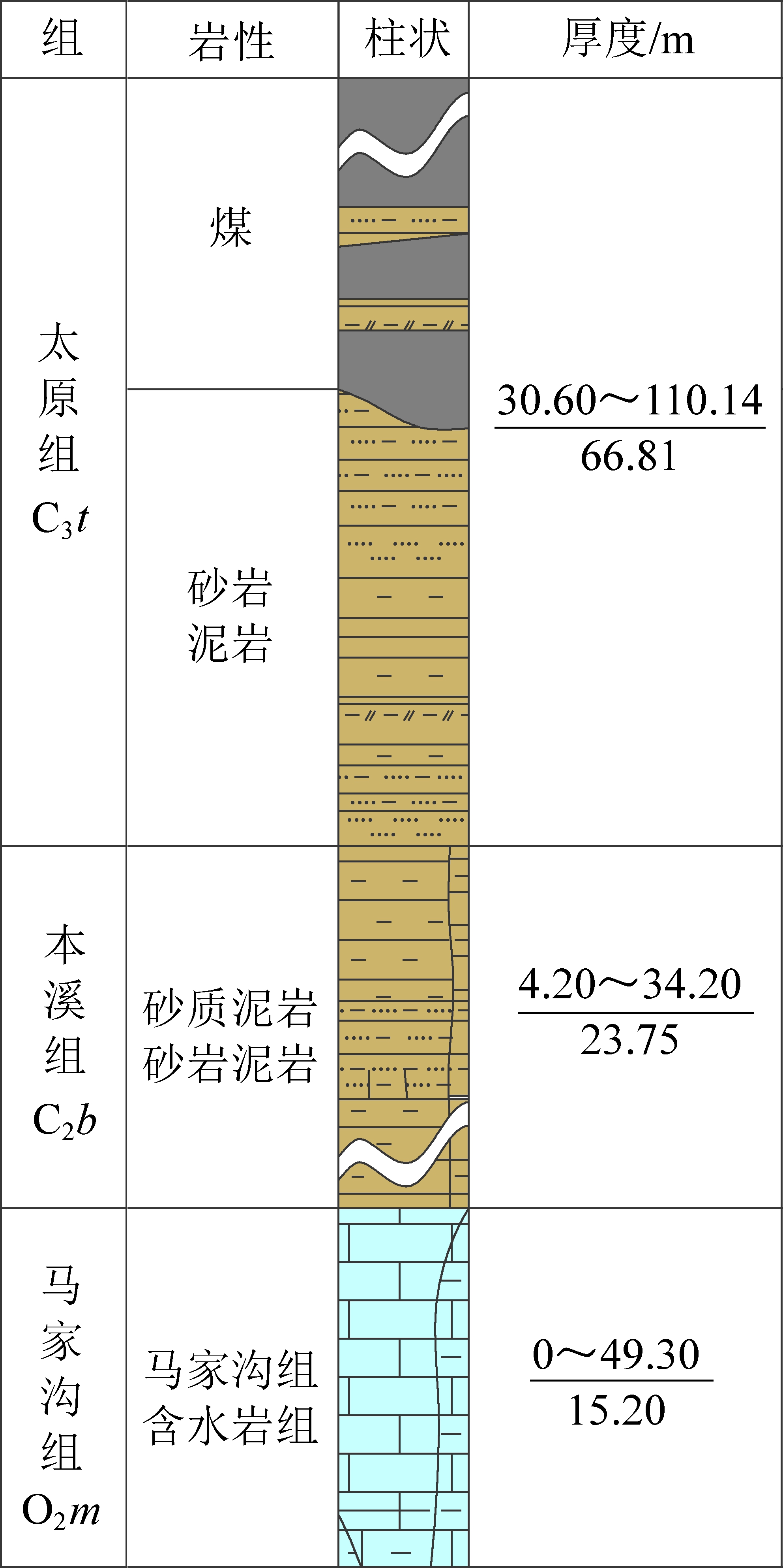 龙王沟矿内煤层距离奥灰近,开采时受到突水威胁,需要研究底板破坏规律,为防治水工作提供依据。该矿位于准格尔煤田水文地质单元中部,是我国大型煤炭基地。主采煤层厚度在20 m以上,寒武奥陶系岩溶裂隙水至主采6号煤的平均距离为48 m,减去底板破坏深度后中间隔水层非常薄,底板岩层层位如图1所示。中间岩层以砂岩和砂质泥岩为主,煤层距马家沟组灰岩近。而且,在岩溶水发育区,岩溶水可通过封闭不良钻孔、断层构造破碎带、底板扰动裂隙带、岩溶陷落柱进入矿坑,是矿井最危险的充水水源,具有水量巨大、不易疏干的特点。而且煤层开采厚度大,底板破坏剧烈,隔水层薄、距奥灰近,给开采带来很大的困难,需要进行底板岩层移动破坏研究。