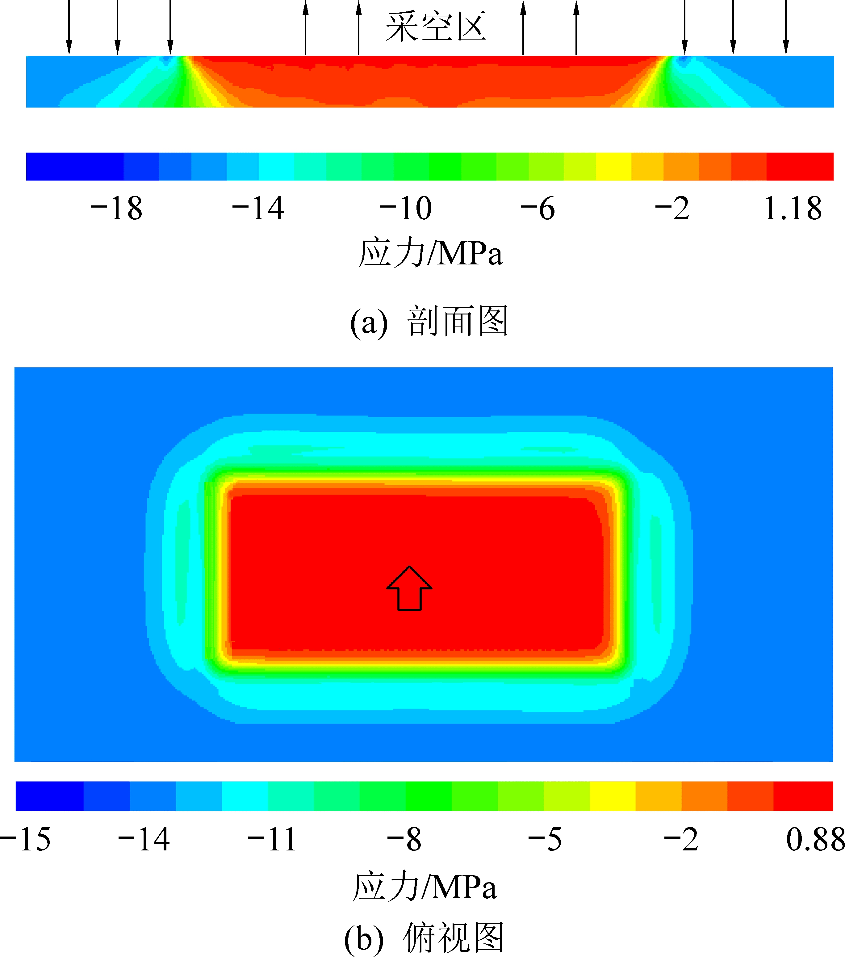 1)岩层的受力状态。煤层开采造成底板破坏,包括剪切破坏和拉破坏。设定底板变形0.5 m时,得到采空区下方直接底板岩层受力大小及状态,如图8所示。两端受压中间受拉,形成类似薄板结构(图8b),岩层受到向上的最大垂向应力1.18 MPa,加快了岩层的破坏。