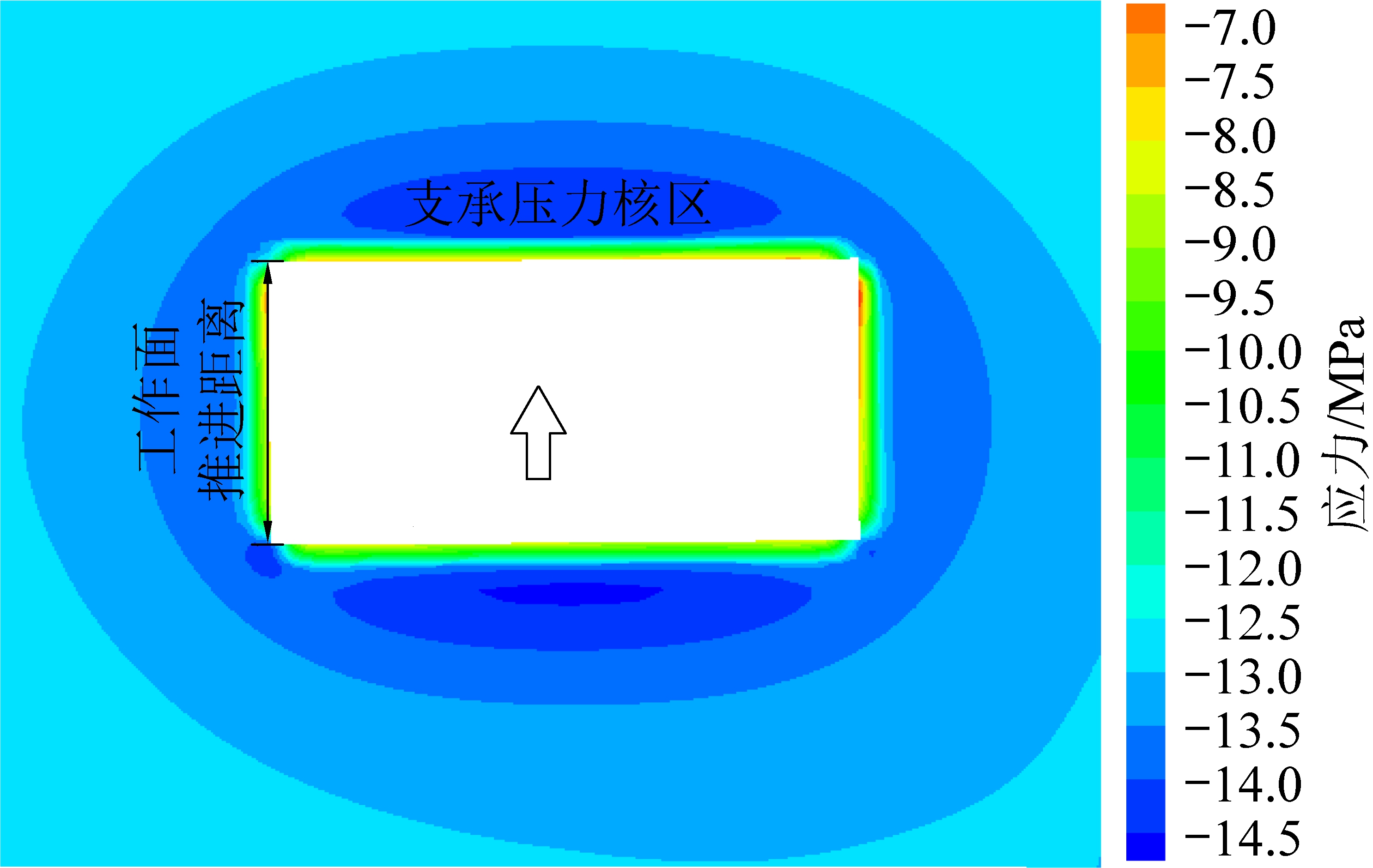 极限平衡区理论计算值偏小,采用数值解,参考工作面推进到工作面长度1/2(120 m)时,支承压力核区距煤壁约20 m,如图3所示。代入式(1)计算得到最大底板破坏深度Dmax=33 m。