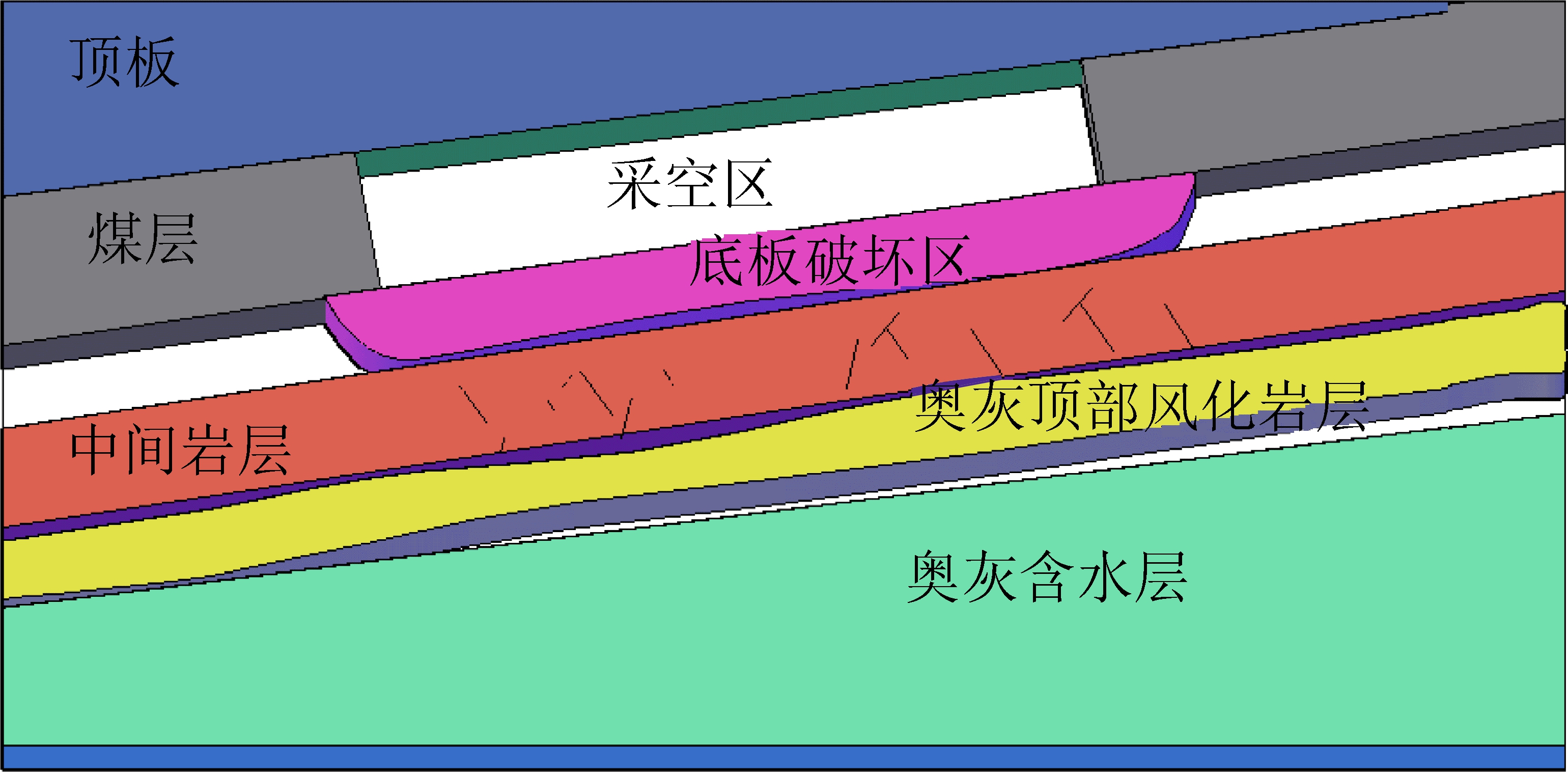 底板破坏区是支承压力作用下压剪破坏区,其下方是中间较完整岩层,在煤层开采后,底板上方垂向应力解除,导致底板岩体状态的应力状态转换,由三向应力状态转换为两向应力状态或者单向应力状态。中间岩层受到扰动时间滞后煤炭开采。奥灰顶界面风化岩层是在成岩过程中形成的,风化岩层原是奥灰岩层,约从晚奥陶纪至中石炭纪,长期遭受风化剥蚀。奥灰含水层,岩性坚硬,强度大,裂隙发育不均,具有导水性。