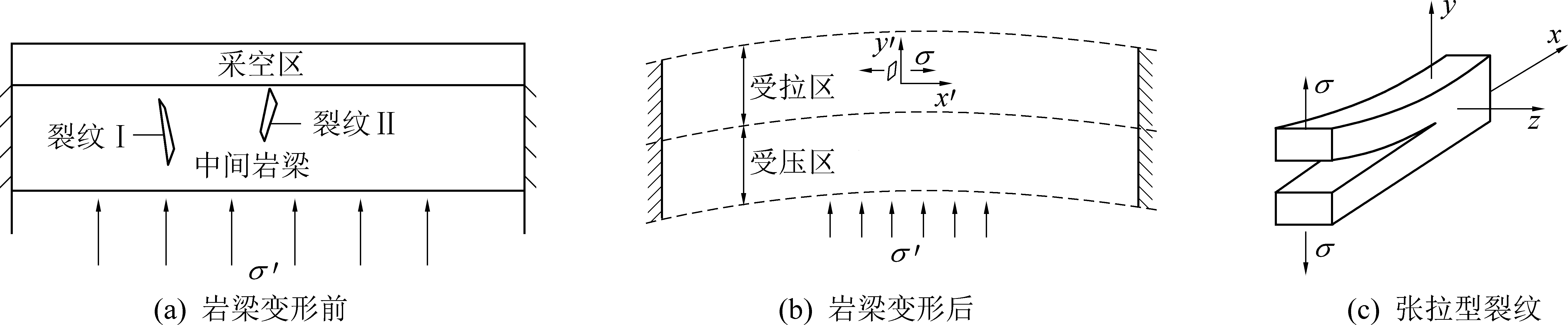 基于薄板结构剖面模型,垂向上,受到底板垂向应力作用的过渡区分为受拉区和受压区,以梁的中性面为界,上方为拉应力区,下方为压应力区,如图5b所示。各区域中的裂纹受力不同,受拉区内,岩体中的裂纹满足I型张开型裂纹条件,当应力达到阈值,裂纹扩展。