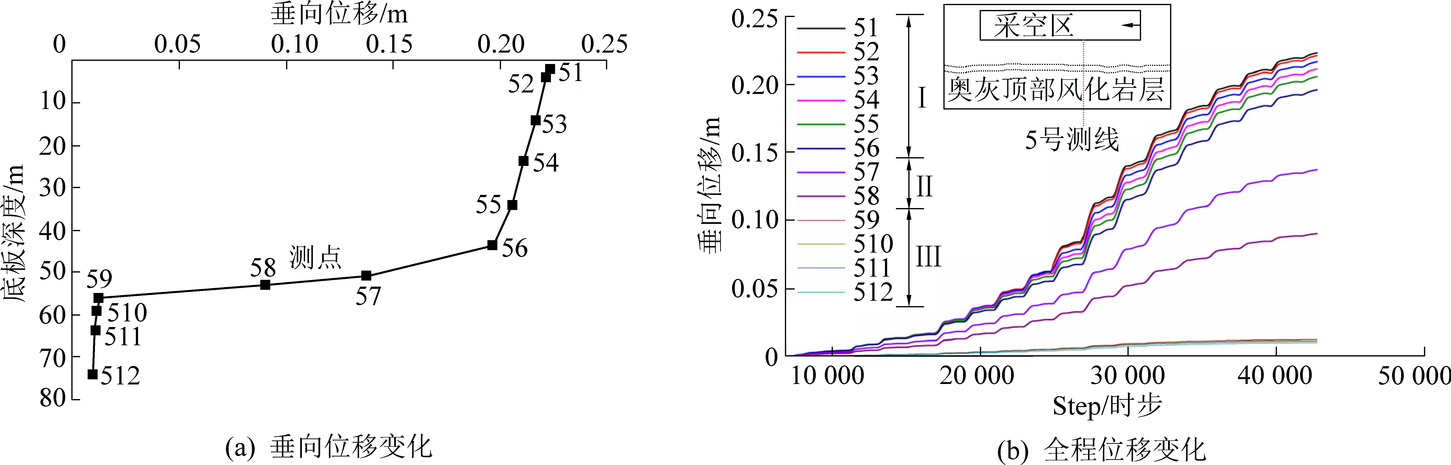 3)监测点瞬态位移变化表明监测点位移曲线垂向上存在2个明显的拐点,将12个监测点位移曲线分为3段,分别对应着风化段上方岩层、风化段和奥灰层,奥灰风化带对底板岩层变形影响明显,需要采取相应加固措施。