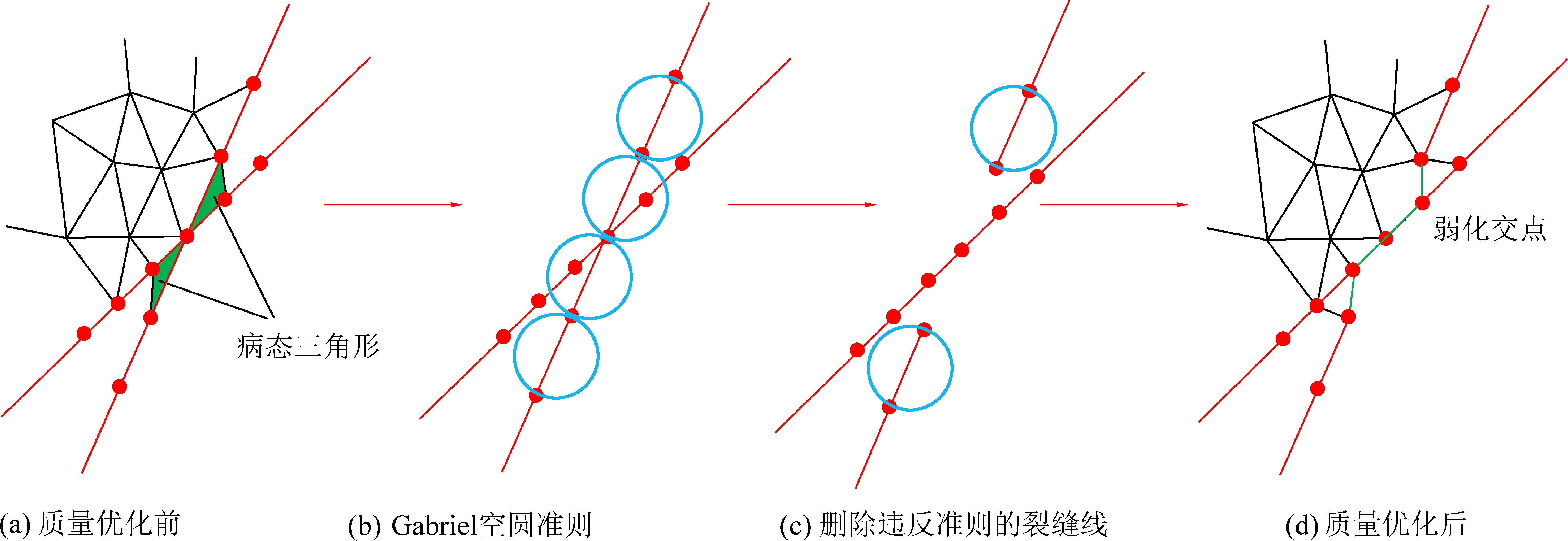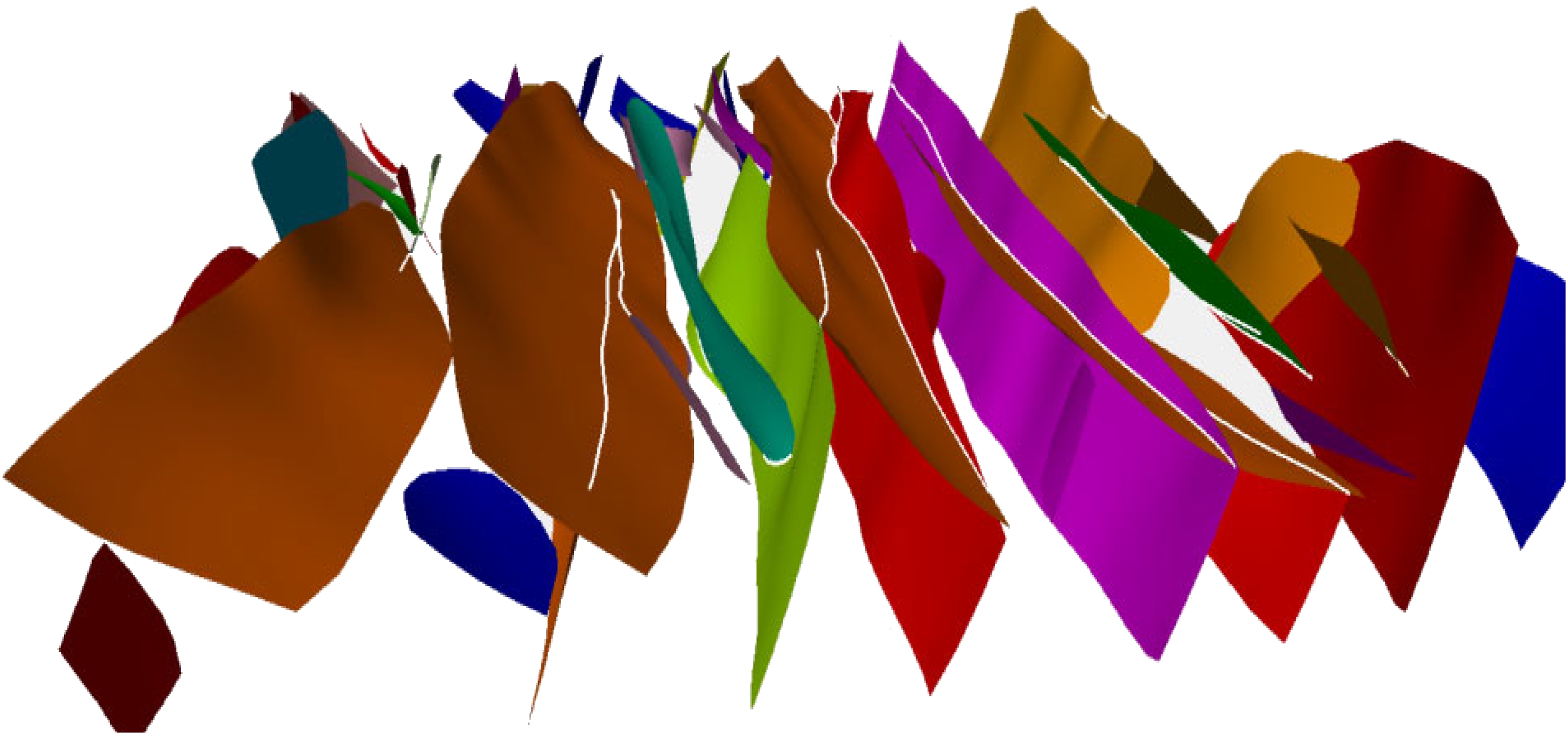 采用非结构化网格对复杂构造进行精细表征,首先需要提取复杂构造的几何信息,以这些几何体为约束进行非结构化网格剖分。若断层等构造几何体十分复杂,采用结构化网格剖分,会造成网格数量巨大,且容易产生大量“病态三角形”[13,18-21],导致网格整体质量变差,计算不稳定,甚至不收敛,这也是目前制约非结构化网格技术大规模商业应用的主要原因之一。