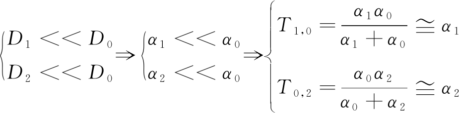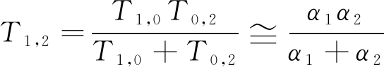 3)裂缝-裂缝(F-F)传导率。通常针对裂缝-裂缝模型构建过程中,地质体中2个裂缝网格之间不存在公共面,无法直接使用式(2)进行计算[11,17-18]。为解决公共面不存在的问题,引入体积无穷小的虚拟网格“0网格”进行计算。“0网格”的特点是与相连两条裂缝都是“正交”连接的,即网格中心点连线0-1和0-2分别与其公共面正交。我们的假设是裂缝网格1到裂缝网格2发生的所有流动都是通过“0网格”传导的。因此有: