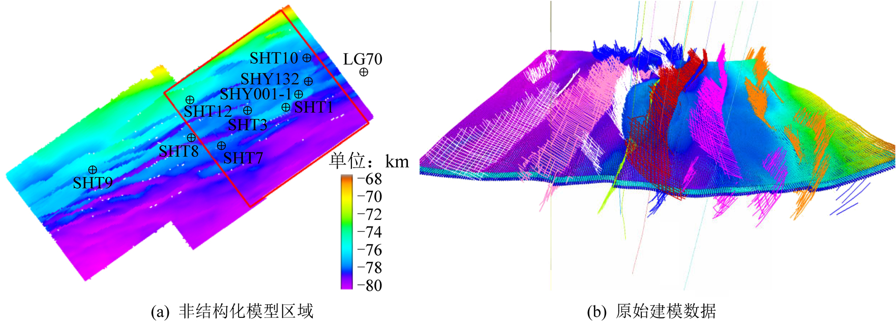 图8 双鱼石地区非结构化模型区域及原始建模数据