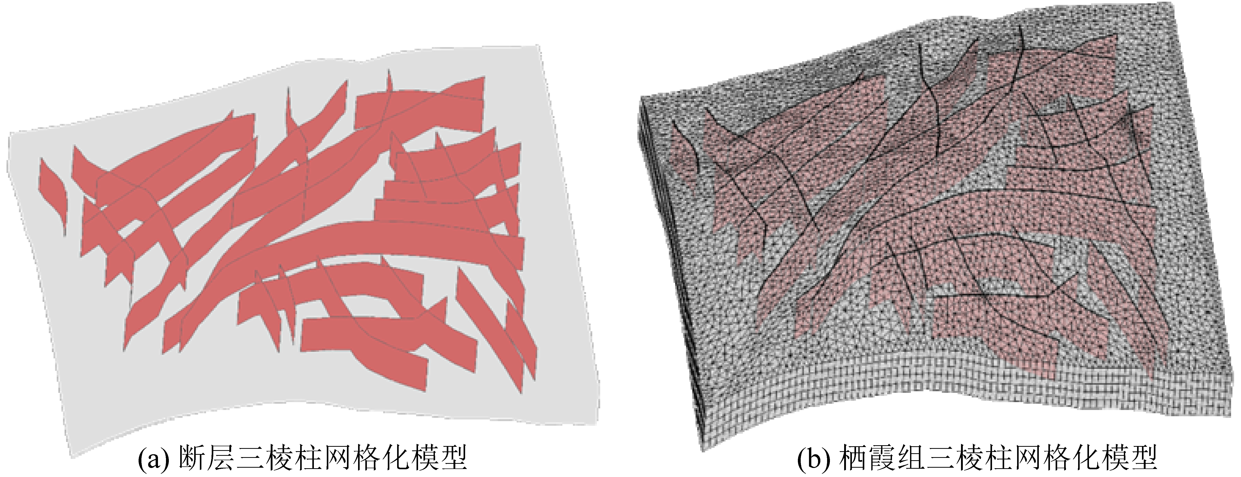 非结构化网格针对高角度构造主要通过三棱柱网格及四面体网格进行划分。三棱柱网格在进行非结构化网格时能有效保留构造层信息、构造正交性良好,适合处理高角度裂缝、断层、薄层模型;四面体网格具有网格化灵活、断层、裂缝精细表征,适合处理复杂断层、裂缝网络。