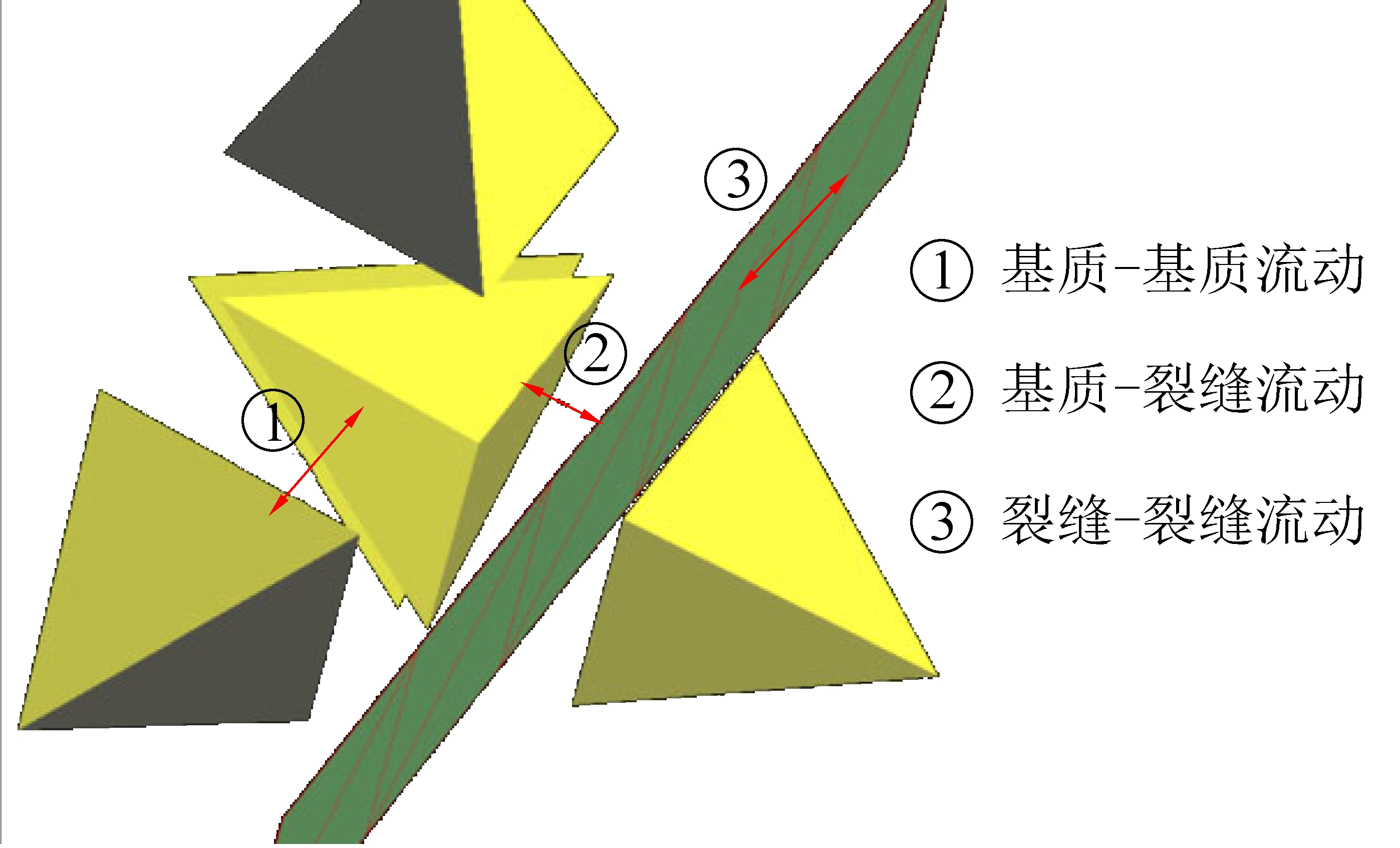 1)基质-基质(M-M)传导率。假设在每个网格内部,压力梯度方向沿着网格控制点与公共边(或公共面)形心连线的方向[13-14],则由流量守恒得: