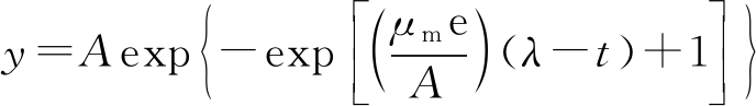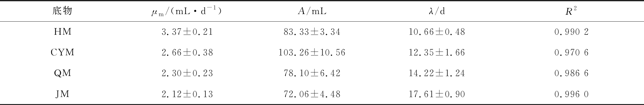 其中:y为累积甲烷产量,mL/g;A为累积甲烷产量潜力,mL/g;μm为最大比甲烷产量,mL/(g·d);λ为滞后期,t,为CH4首次产生所用的时间,也表示微生物适应环境所用的时间。