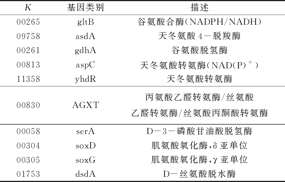 K基因类别描述00265gltB谷氨酸合酶(NADPH/NADH)09758asdA天冬氨酸4-脱羧酶00261gdhA谷氨酸脱氢酶00813aspC天冬氨酸转氨酶(NAD(P)+)11358yhdR天冬氨酸转氨酶00830AGXT丙氨酸乙醛转氨酶/丝氨酸乙醛转氨酶/丝氨酸丙酮酸转氨酶00058serAD-3-磷酸甘油酸脱氢酶00304soxD肌氨酸氧化酶,δ亚单位00305soxG肌氨酸氧化酶,γ亚单位01753dsdAD-丝氨酸脱水酶