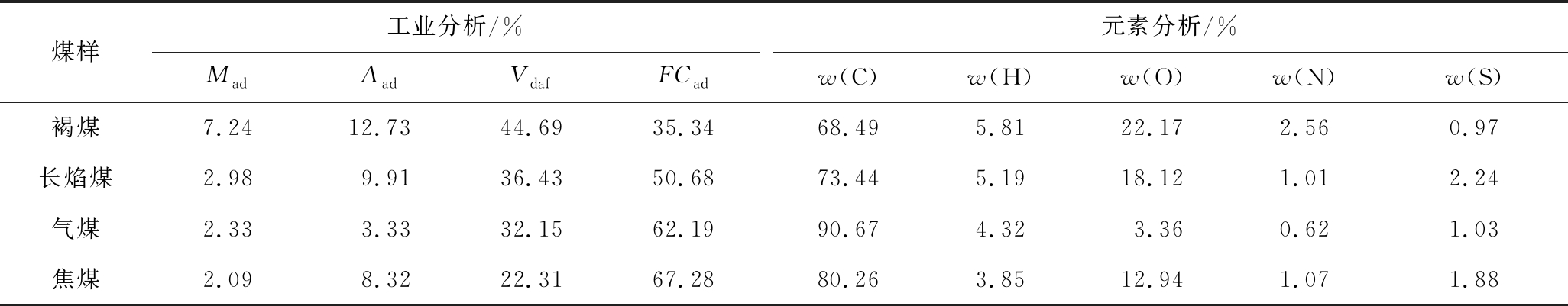 试验煤样选择内蒙古胜利煤田、河南义马千秋煤矿、山西大同泉岭煤矿和河南平顶山煤矿新鲜的褐煤、长焰煤、气煤和焦煤,煤样工业分析和元素分析分别按照国家标准GB/T 30732—2014和GB/T 31391—2015进行,测试结果见表1。试验前将煤样粉碎至80~100目(0.15~0.18 mm),并在60 ℃下干燥24 h,密封保存。