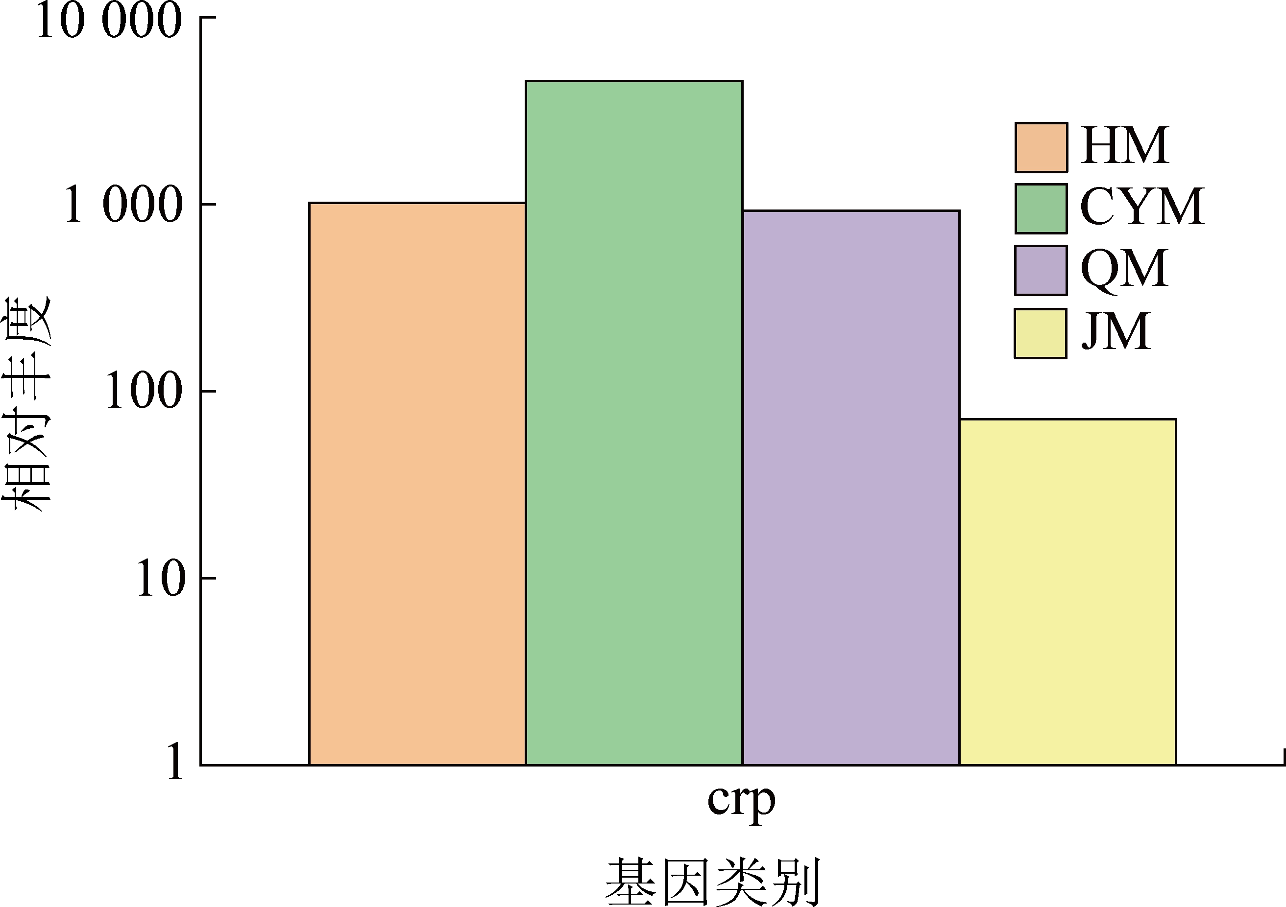 此外,在CYM中的群体感应基因的相对丰度最高。群体感应是一种调节系统,可以展示细菌的细胞密度信息,并表达相应的调节基因。群体调控包括毒力因子产生、抗生素合成、细胞运动、孢子形成和生物膜形成[34-35]。本研究中,与胞外多糖合成和生物膜形成相关的crp基因[36]相对丰度在CYM中显著增加(图6),该基因描述见表5。生物膜的形成对于保护细胞免受外界侵袭,提高细胞对环境压力的抵抗力和耐受性非常重要,同时更多的胞外多糖表明有更多的底物为产酸细菌提供了产生挥发性脂肪酸的途径,这也是CYM中甲烷产量较多的主要原因之一。