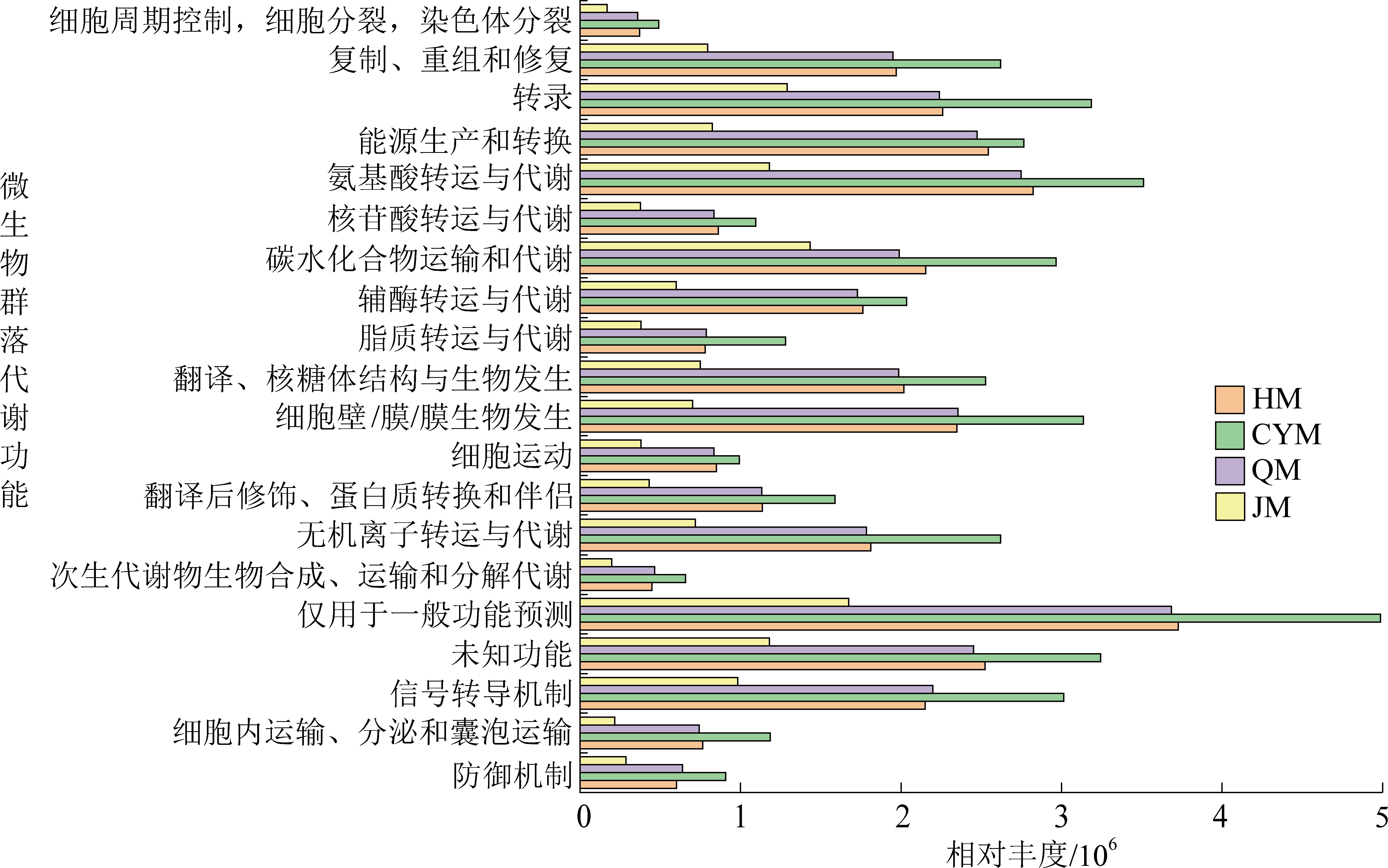在不同煤阶煤的厌氧发酵产甲烷过程中,CYM参与微生物代谢功能的相对丰度明显高于其他试验组(图2),这意味着以长焰煤作为发酵底物,可明显改善有机物如碳水化合物、氨基酸和其他化合物的生物转化。众所周知,厌氧发酵过程中碳水化合物和氨基酸被生物代谢成挥发性脂肪酸是重要的且必经的决定步骤,因此,微生物代谢功能的增强与高挥发性脂肪酸的产生是一致的。