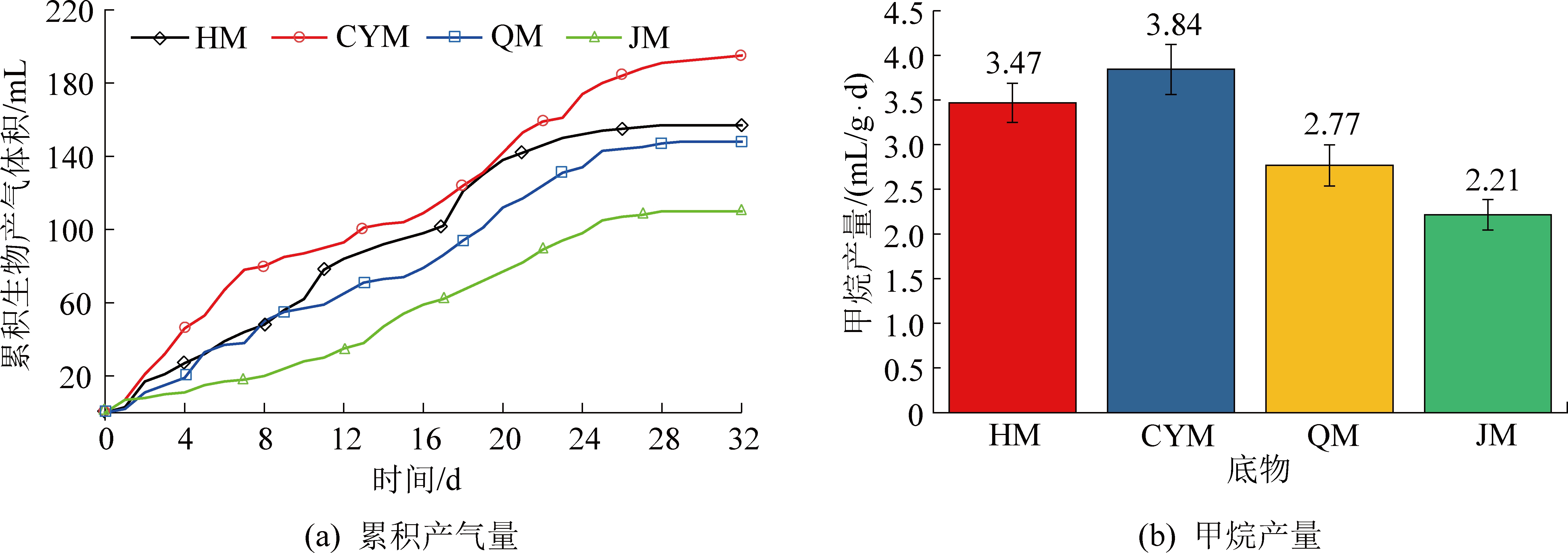 培养基配制方案按照文献[14]进行准备。将配制好的培养基放入高温灭菌锅内于121 ℃灭菌3 h,灭菌结束后按照3∶1的比例倒入驯化的菌液(来源为矿井水),利用N2驱替瓶内空气3 min,用封口膜密封,放置在35 ℃恒温培养箱中富集4 d。将20 g粉碎后的煤样加入250 mL锥形瓶内,同时加入富集4 d的菌液200 mL,利用N2驱替瓶内空气3 min,搅拌均匀后放入35 ℃恒温培养箱进行为期32 d的产气实验,每组实验设置3个平行样。用集气袋收集气体,甲烷定量分析使用气相色谱仪(Agilent 7890GC)。分别用HM、CYM、QM和JM表示以褐煤、长焰煤、气煤与焦煤为底物的生物产气试验。
