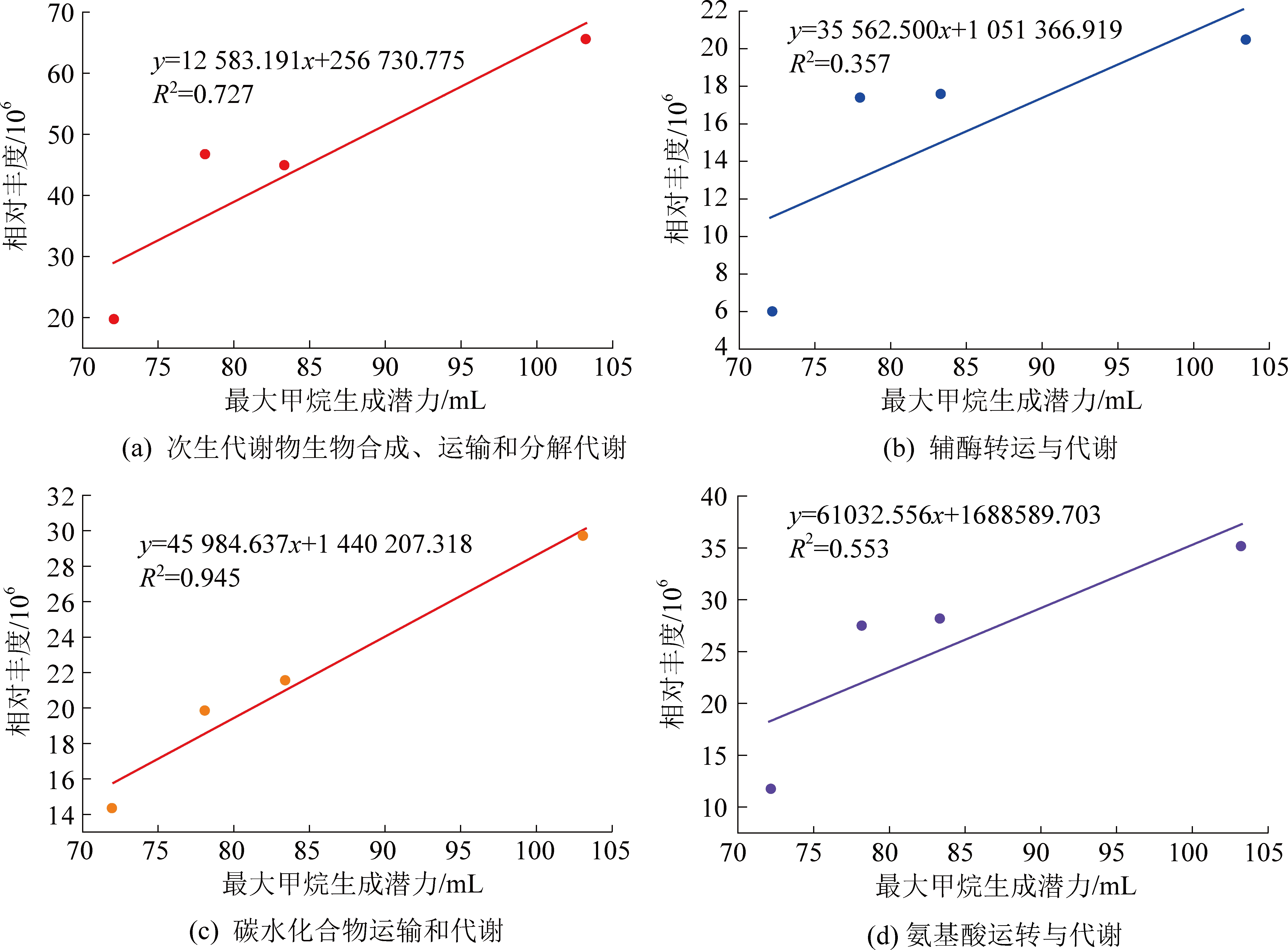 3)高的煤制生物甲烷产量,其参与微生物代谢功能的相对丰度也最高,且参与辅酶转运与代谢和碳水化合物运输和代谢这2种代谢功能与最大甲烷生成潜力之间存在良好的线性关系。