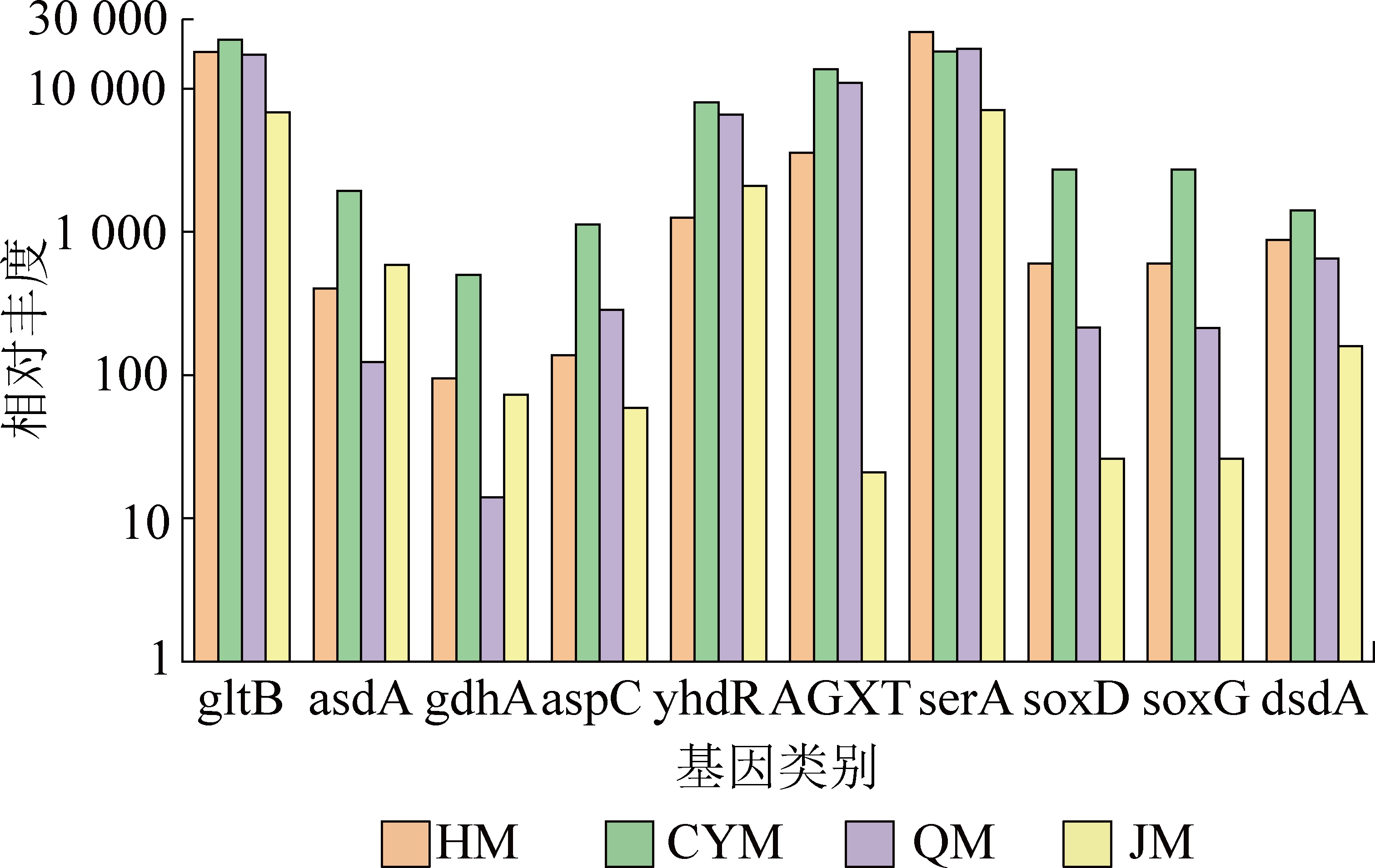 通常氨基酸的代谢是指其形成和转化。因此,通过根据氨基酸的形成和转化相关基因的相对丰度来进行预测分析,相关功能基因描述见表3,分析对比结果如图4所示。