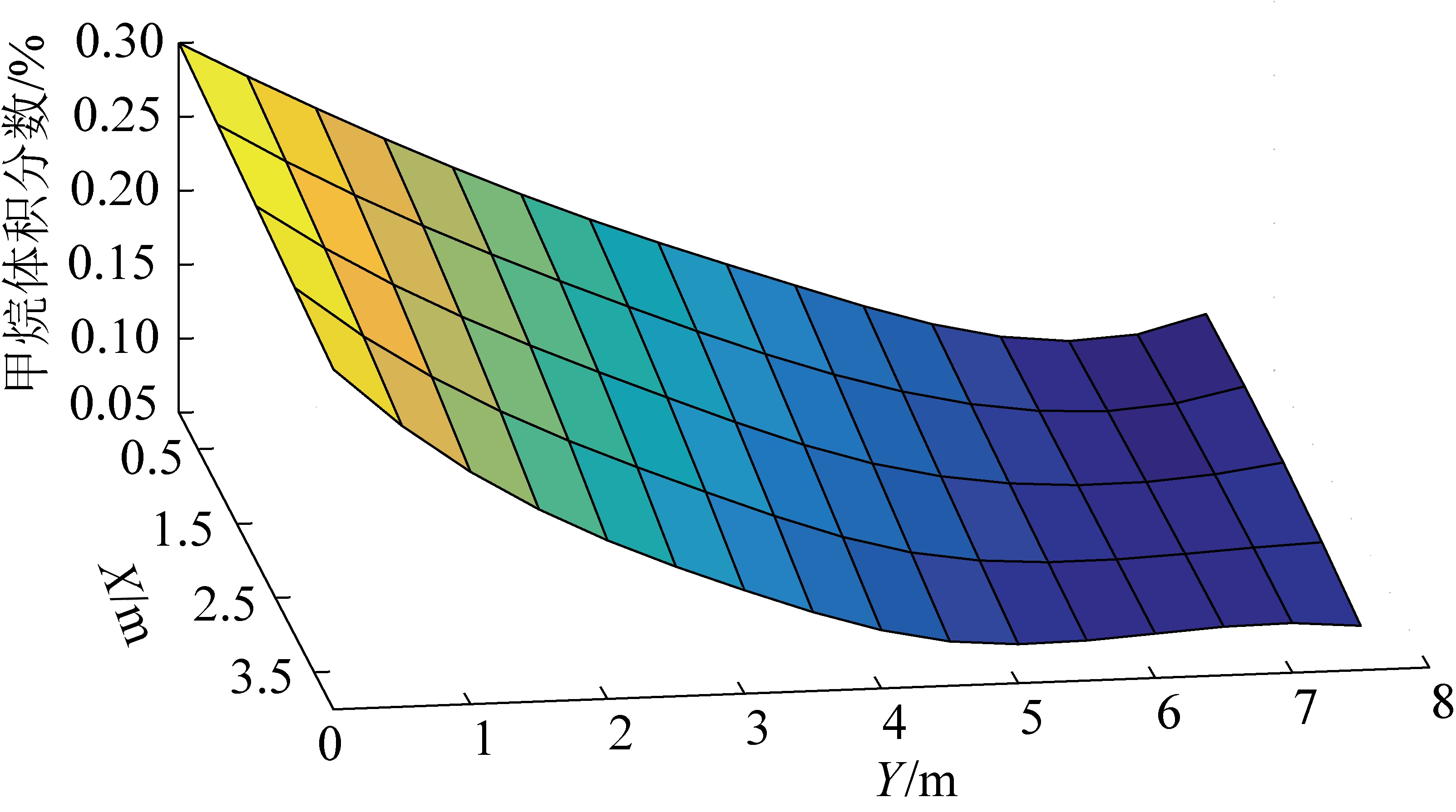 1)下隅角插值。下隅角区域是指Y方向0~7.5 m、X方向0~4 m的X-Y平面,利用二维三次样条插值,获得该区域内Y方向每0.5 m、X方向每1 m的插值点,插值结果如图4所示,由图4可知,在下隅角区域内,沿着支架走向(Y方向)从下隅角向里,甲烷浓度呈现缓坡式下滑,下隅角位置甲烷浓度最高,说明下隅角易积聚甲烷;沿X方向支架内部甲烷浓度高于支架外部甲烷浓度,这是因为支架外部通风条件好于内部,甲烷在支架外部不易积聚。