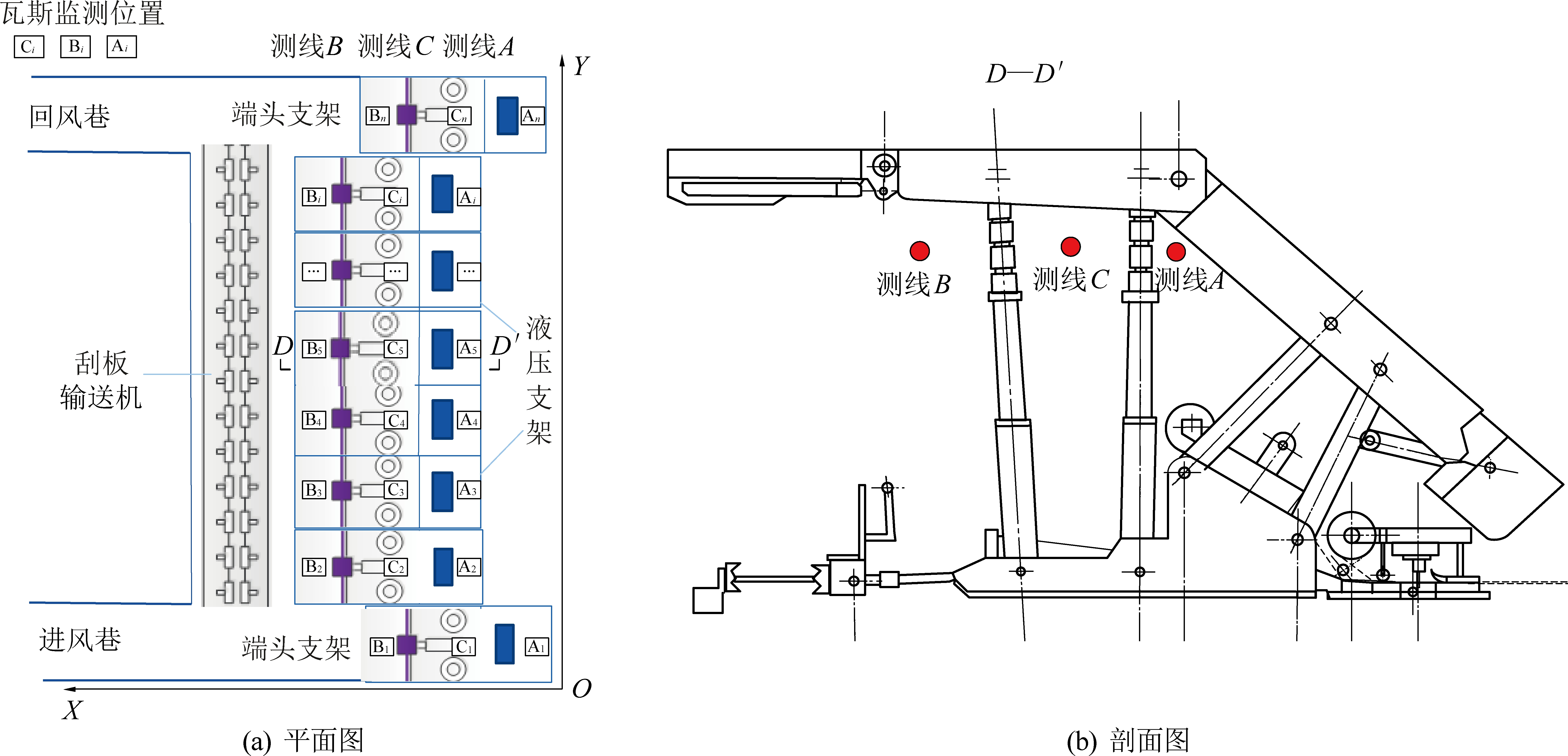 2)针对监控系统工作面区域甲烷监测点少,人工检测甲烷数据实时性、可读性和共享性不足的问题,以工作面区域落煤甲烷涌出、煤壁甲烷涌出和采空区甲烷涌出3大主要涌出特征为基础,结合现场生产班和检修班的实测甲烷数据分布特征,提出了综采工作面区域的物联甲烷感知终端布置方案。